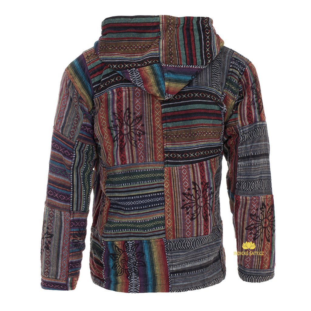 Tento kabát z Nepálu je ušitý z velmi pevné, festovní kabátové bavlny a podšitý fleesem (měkký a hřejivý materiál vyrobený z umělých vláken, dobře udržuje teplo, příjemný na nošení). Kabát je teplý, vhodný od podzimu do jara.