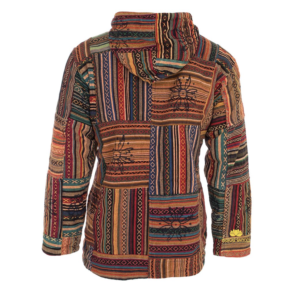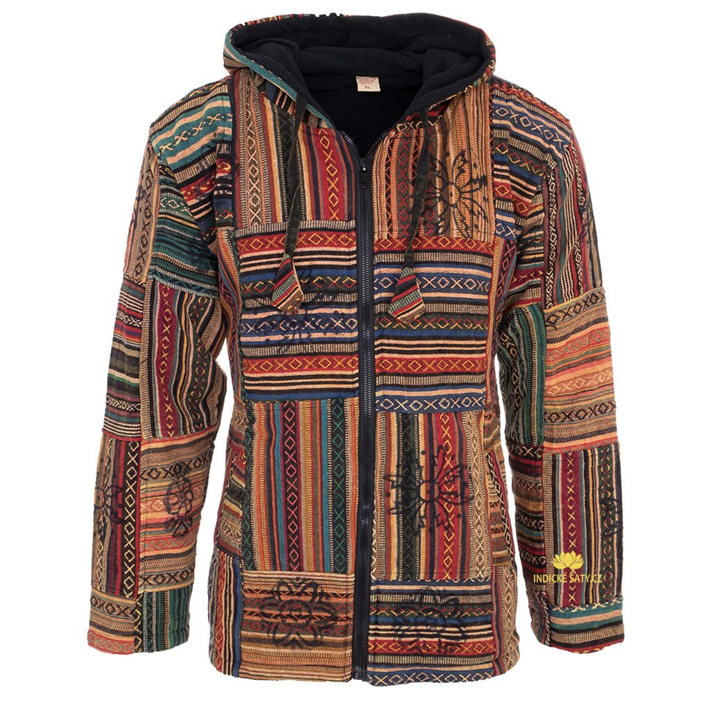 Tento kabát z Nepálu je ušitý z velmi pevné, festovní kabátové bavlny a podšitý fleesem (měkký a hřejivý materiál vyrobený z umělých vláken, dobře udržuje teplo, příjemný na nošení). Kabát je teplý, vhodný od podzimu do jara.