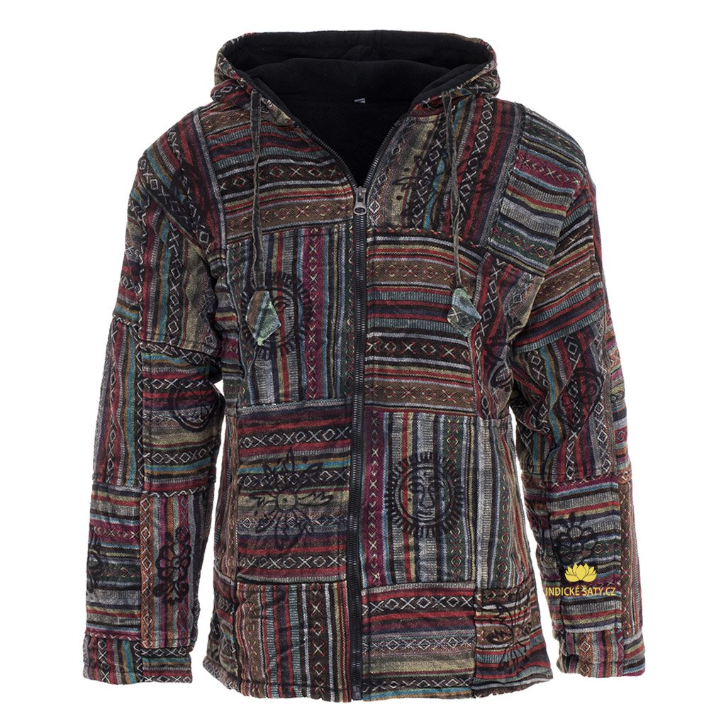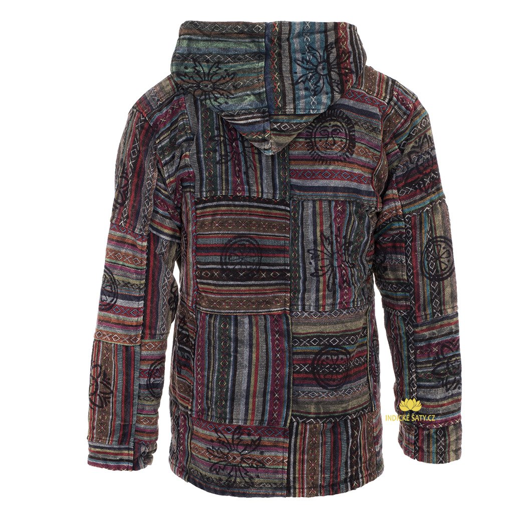 Tento kabát z Nepálu je ušitý z velmi pevné, festovní kabátové bavlny a podšitý fleesem (měkký a hřejivý materiál vyrobený z umělých vláken, dobře udržuje teplo, příjemný na nošení). Kabát je teplý, vhodný od podzimu do jara.