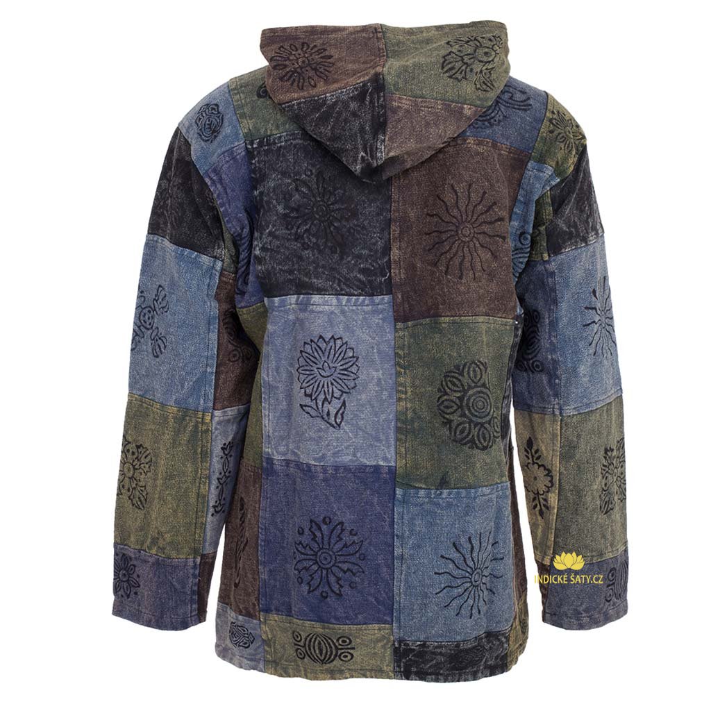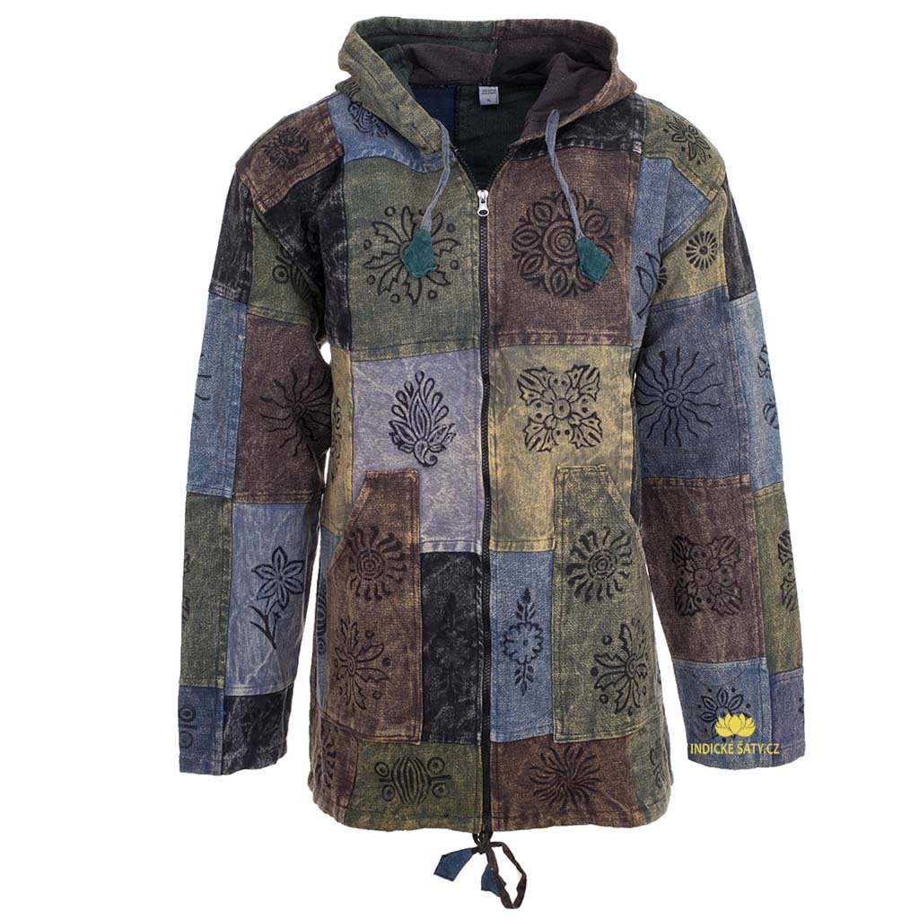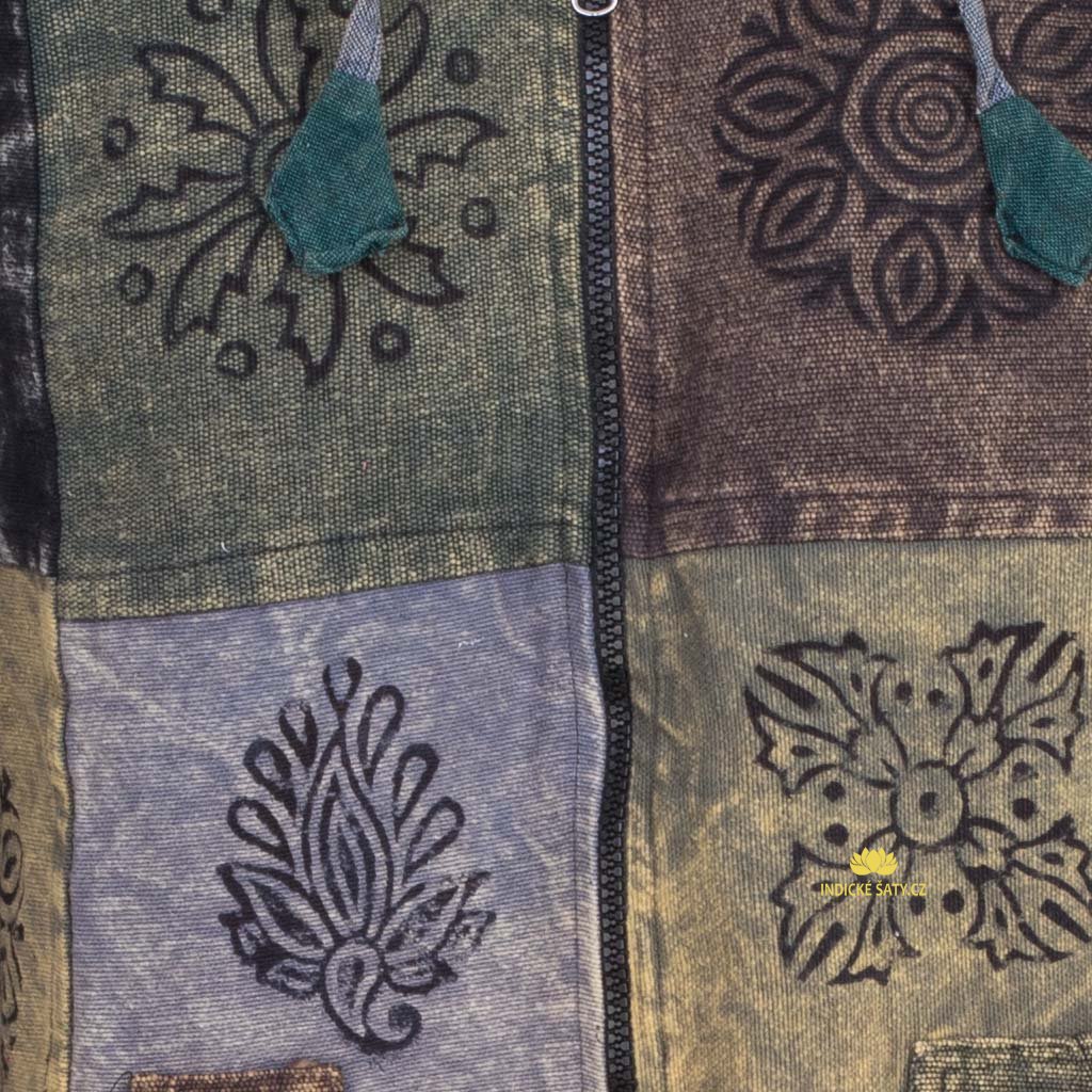 Patchworková bunda na zip ušitá ze silné bavlny, s ručním tiskem a kapucí. Více v popisu níže.