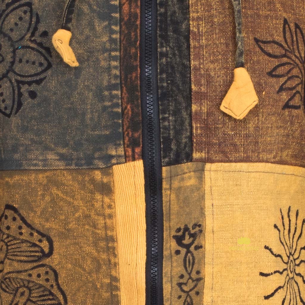 (XL) Patchworková bunda na zip z pevné bavlny s ručním tiskem a kapucí
