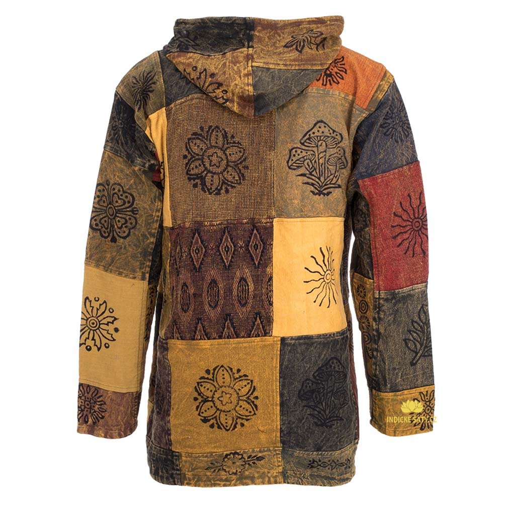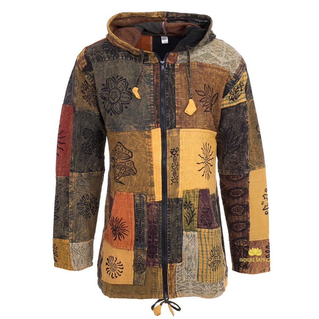 Patchworková bunda na zip ušitá ze silné bavlny, s ručním tiskem a kapucí. Více v popisu níže.