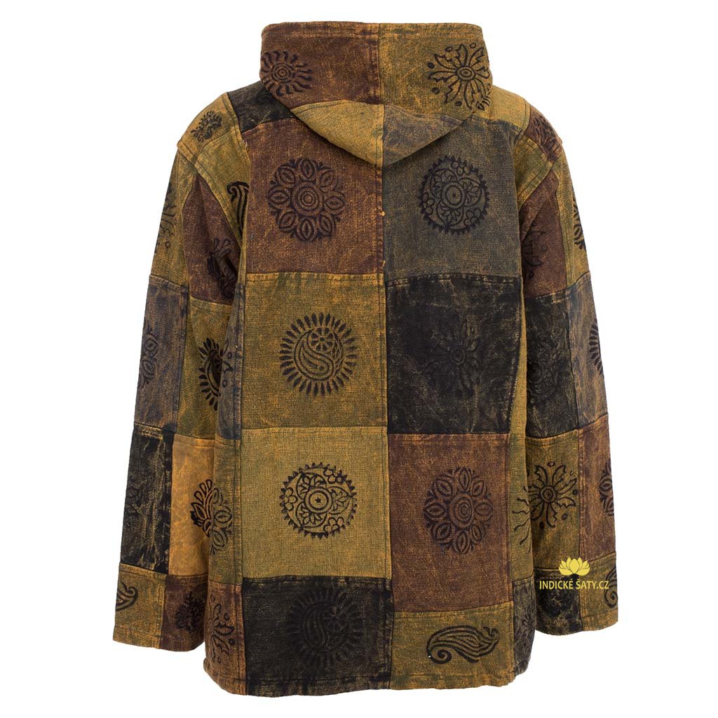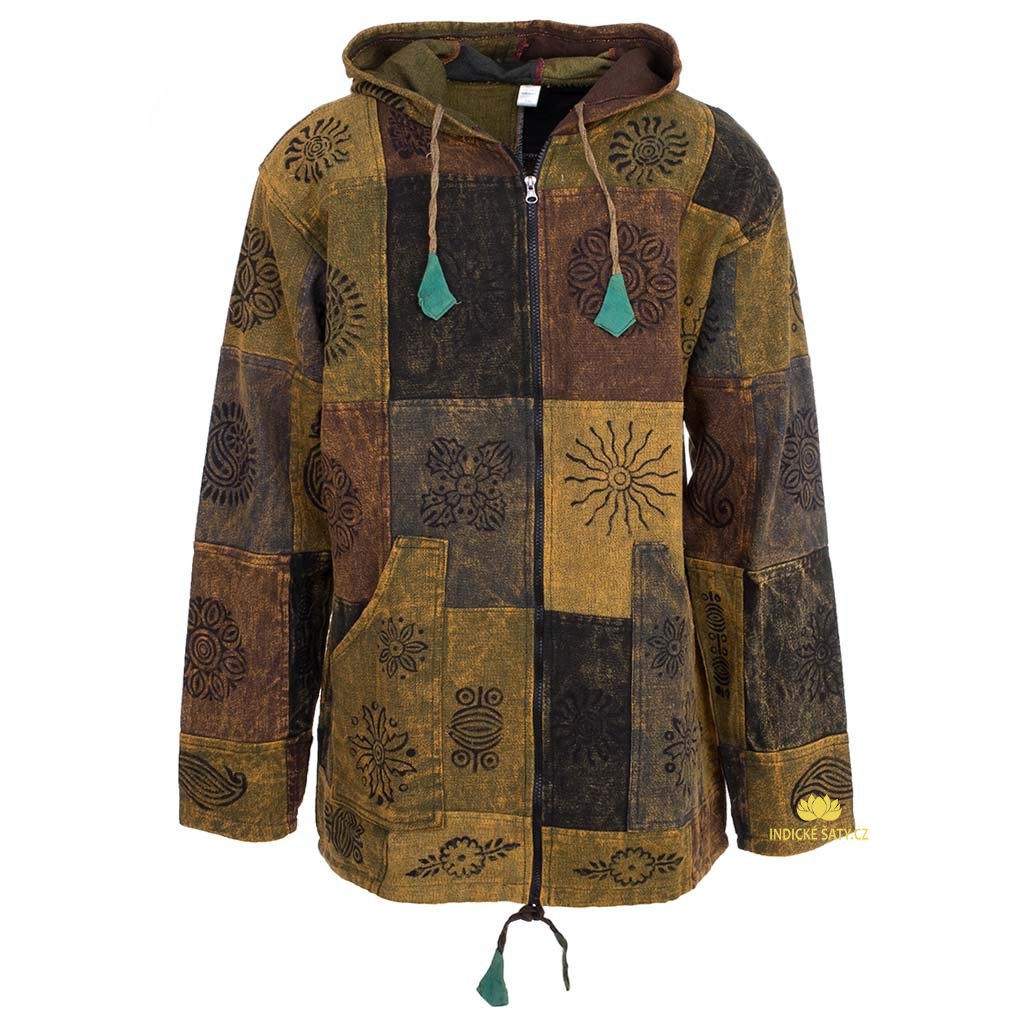 Patchworková bunda na zip ušitá ze silné bavlny, s ručním tiskem a kapucí. Více v popisu níže.
