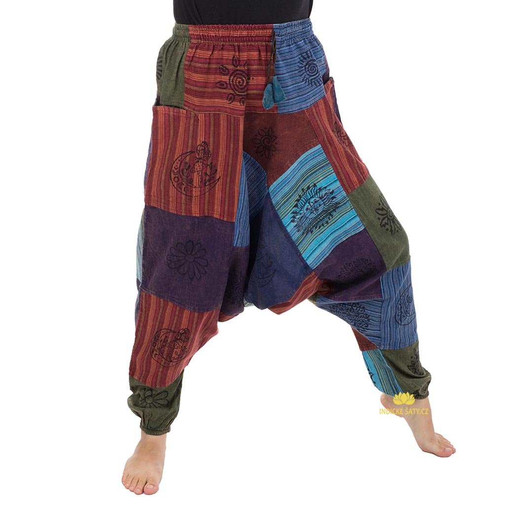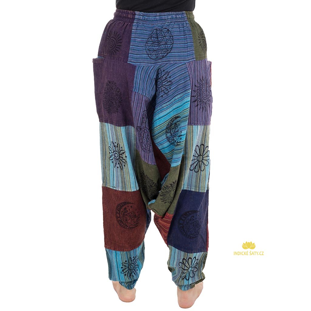 Harémové kalhoty s ručním tiskem, patchworkově šité z kvalitní bavlny. Více v popisu níže.
