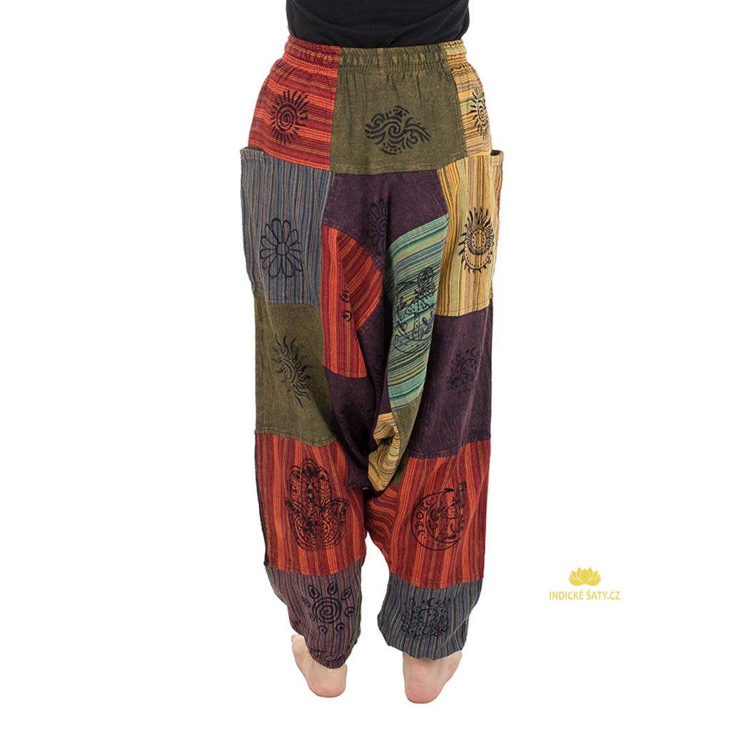 Harémové kalhoty s ručním tiskem, patchworkově šité z kvalitní bavlny. Více v popisu níže.