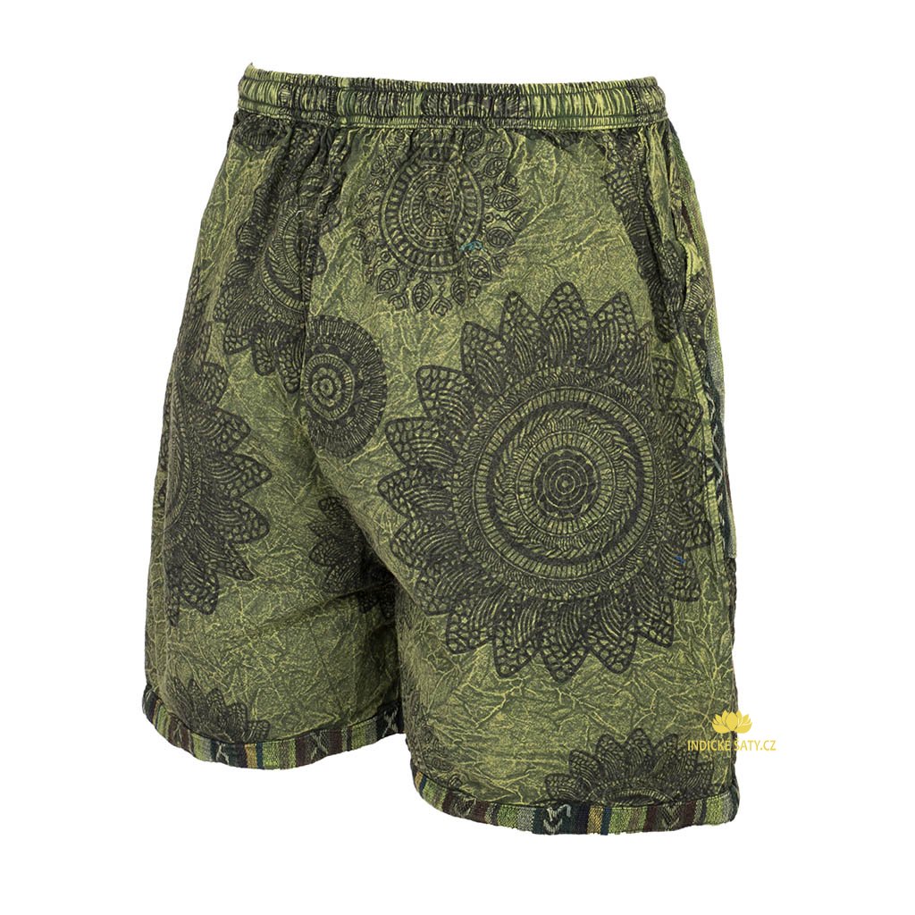 Kraťasy z pevné bavlny, ke kolenům, barvené stonewashem a zdobené tiskem mandal. Více v popisu níže.