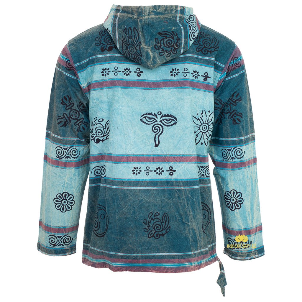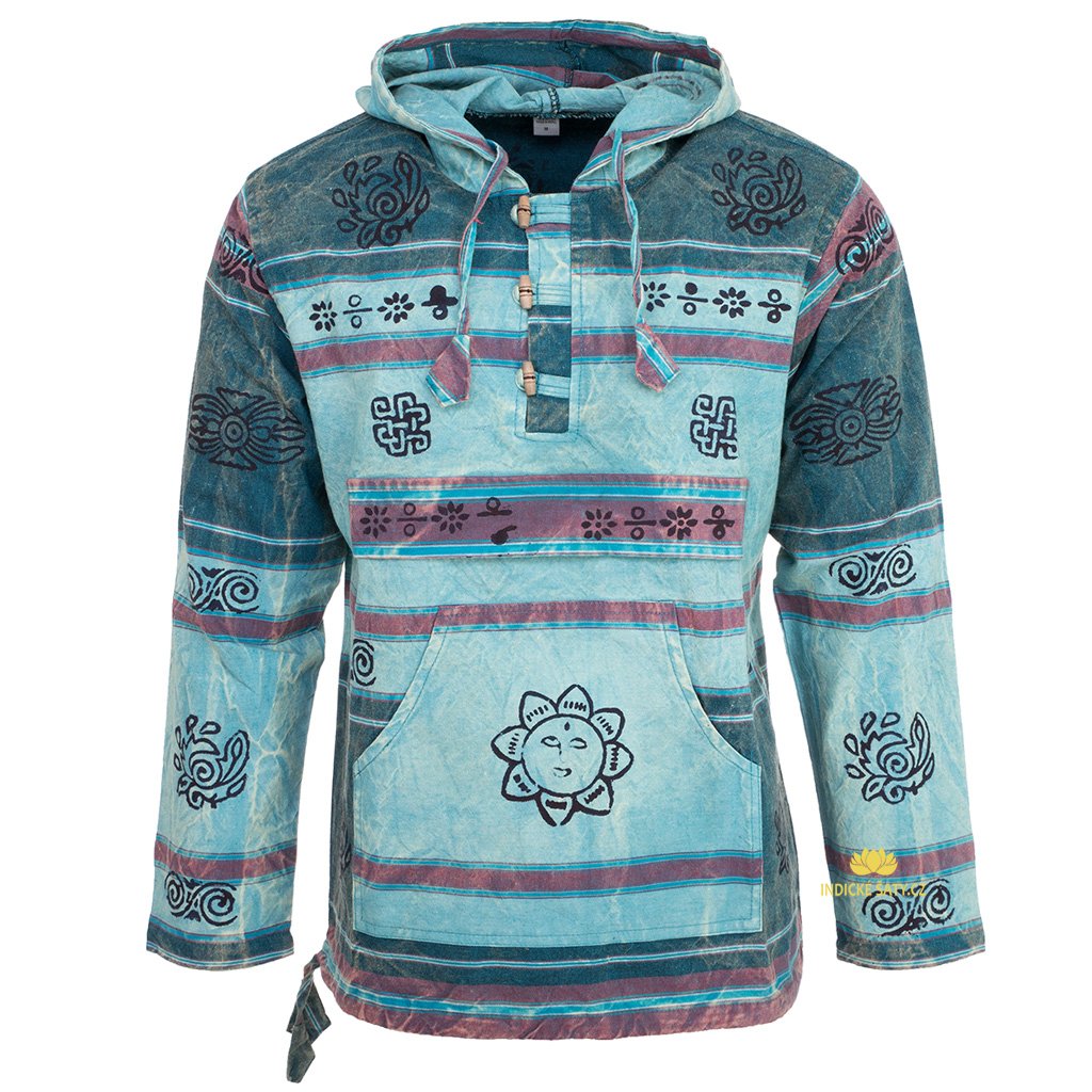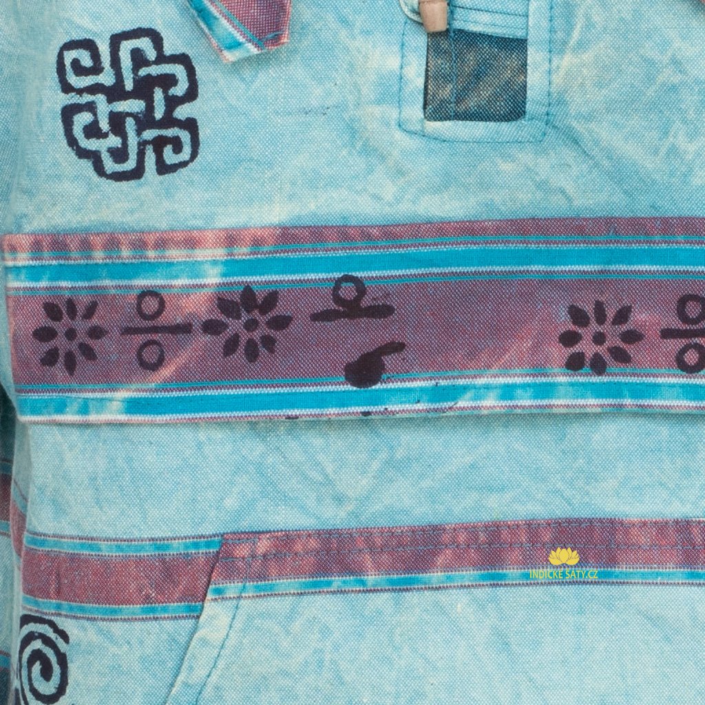 Ručně tištěný bavlněný pulover s kapucí, klokánkem a stahováním v pase. Více v popisu níže.