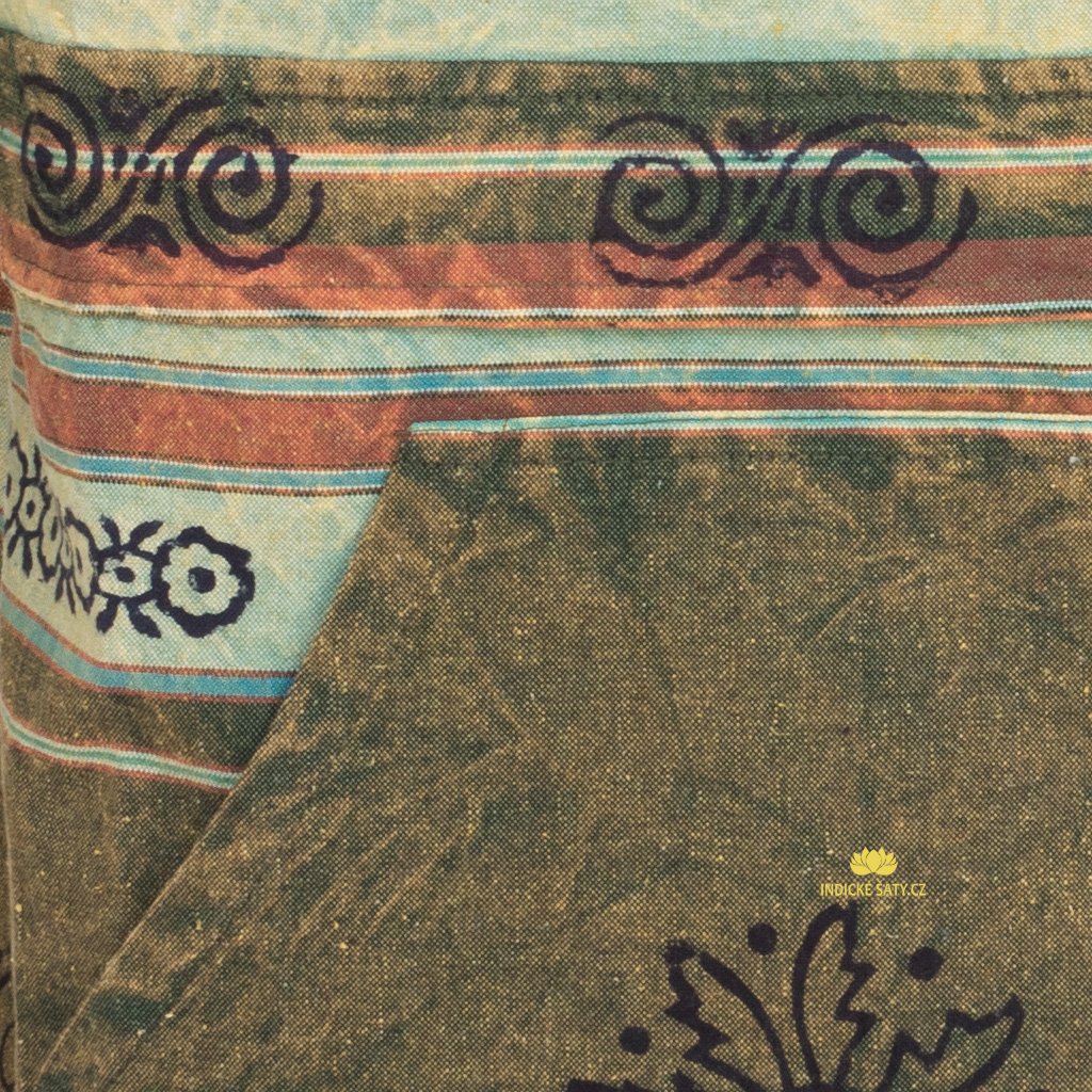 Tento pulover (přes hlavu) je ušitý z pevnější bavlny, látka připomíná hrubší plátno. Je prodyšná, příjemná na omak. Látka je v základu stonewashově upravená, následně je pulover ozdoben ručním tiskem (rozložení tisku a vzory se kus od kusu liší).