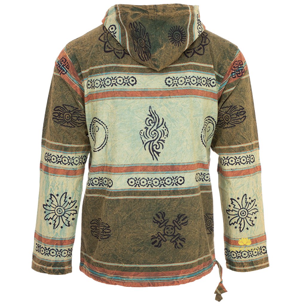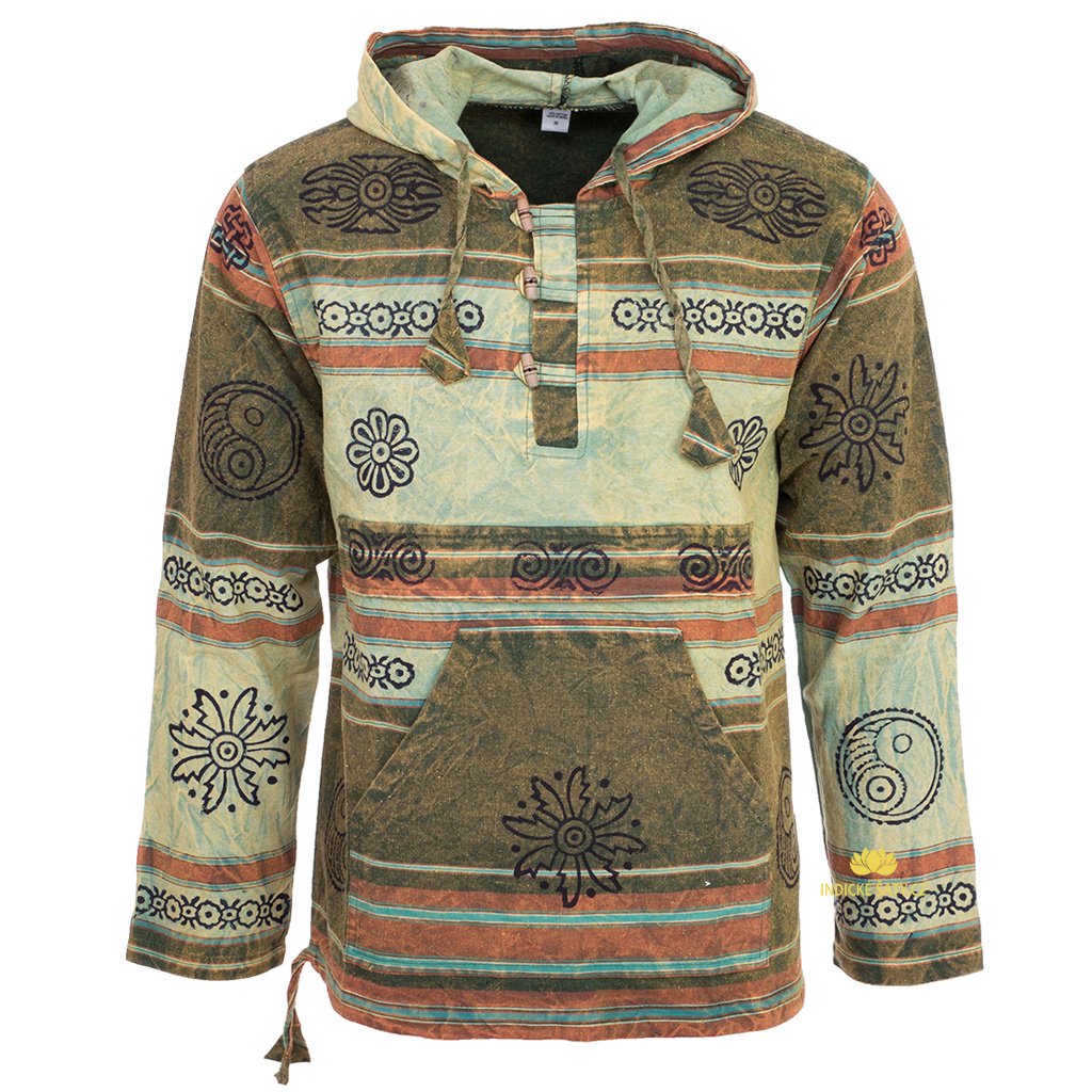 Ručně tištěný bavlněný pulover s kapucí, klokánkem a stahováním v pase. Více v popisu níže.