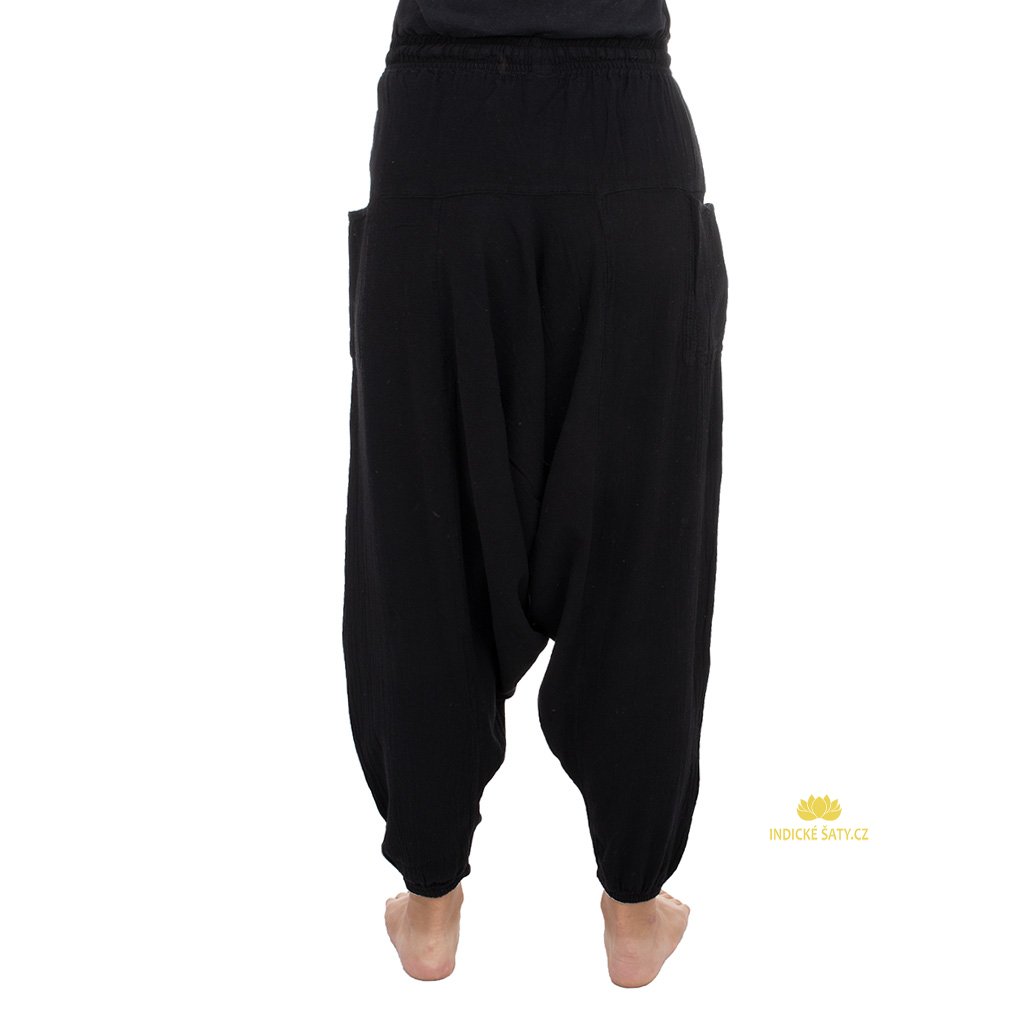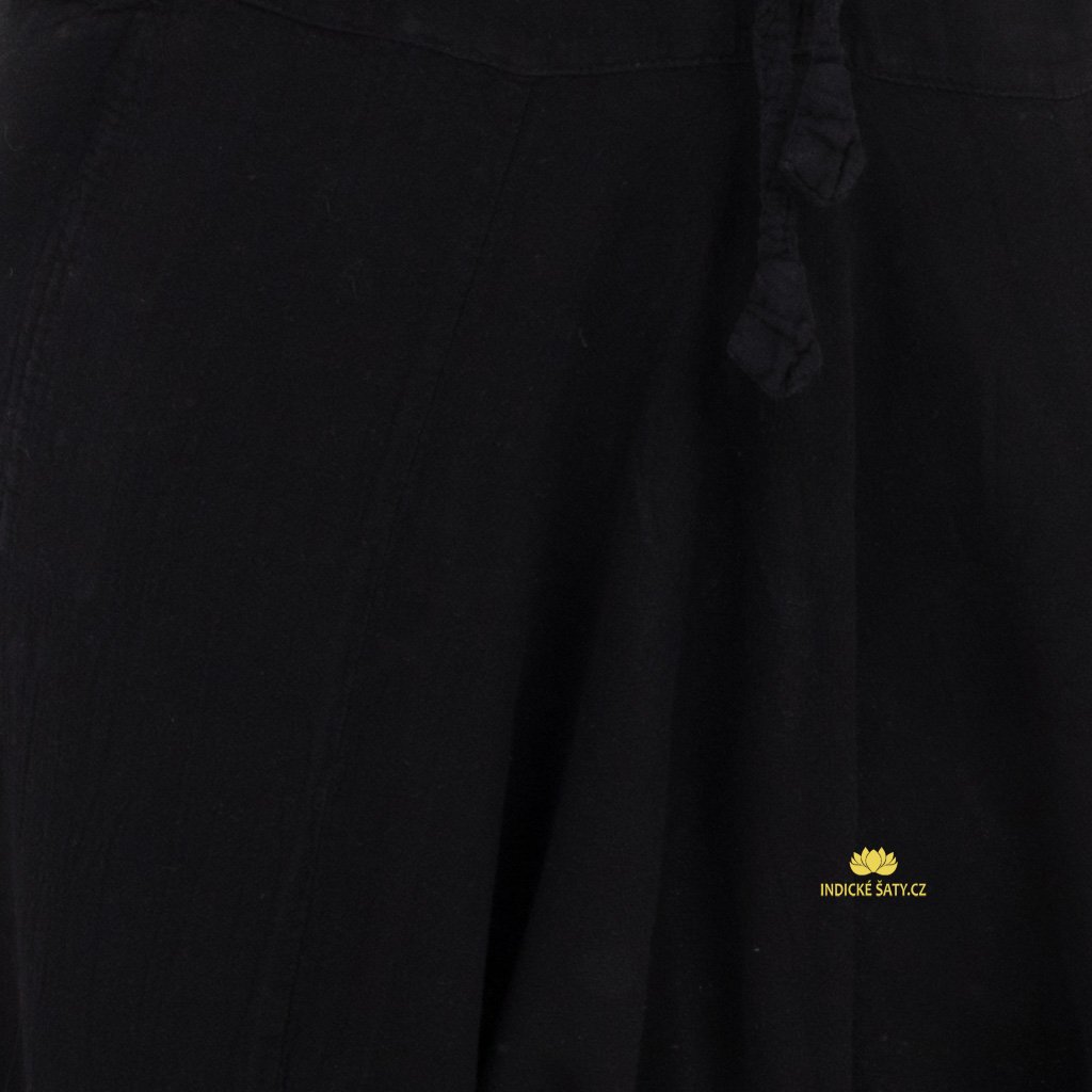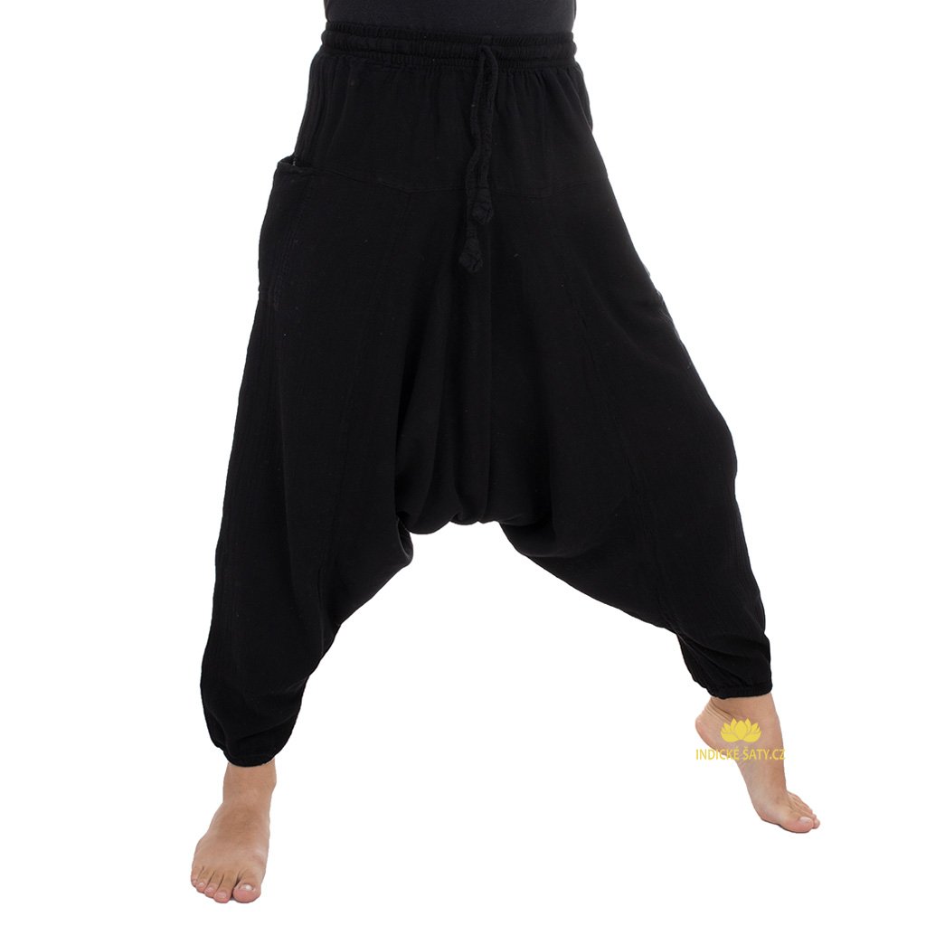 Kalhoty mají klasický harémový střih - tedy snížený sed. Ten je pěkně vykrojený, dostatečně široký, na chůzi pohodlný. V pase najdete širší gumu (cca 3,5 cm) a stahování na bavlněné provázky ukončené látkovými zvonečky. V pase po obou stranách dvě otevřené kapsy velikosti na dlaň. Nohavice jsou ukončené tenčími gumičkami (1 cm), které jsou dostatečně široké, nestahují. Lze pohodlně podkasat.
