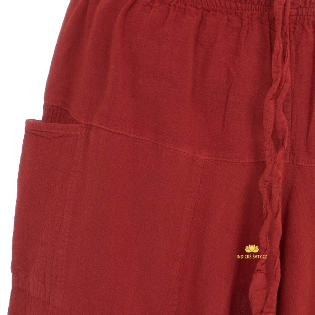Kalhoty mají klasický harémový střih - tedy snížený sed. Ten je pěkně vykrojený, dostatečně široký, na chůzi pohodlný. V pase najdete širší gumu (cca 3,5 cm) a stahování na bavlněné provázky ukončené látkovými zvonečky. V pase po obou stranách dvě otevřené kapsy velikosti na dlaň. Nohavice jsou ukončené tenčími gumičkami (1 cm), které jsou dostatečně široké, nestahují. Lze pohodlně podkasat.