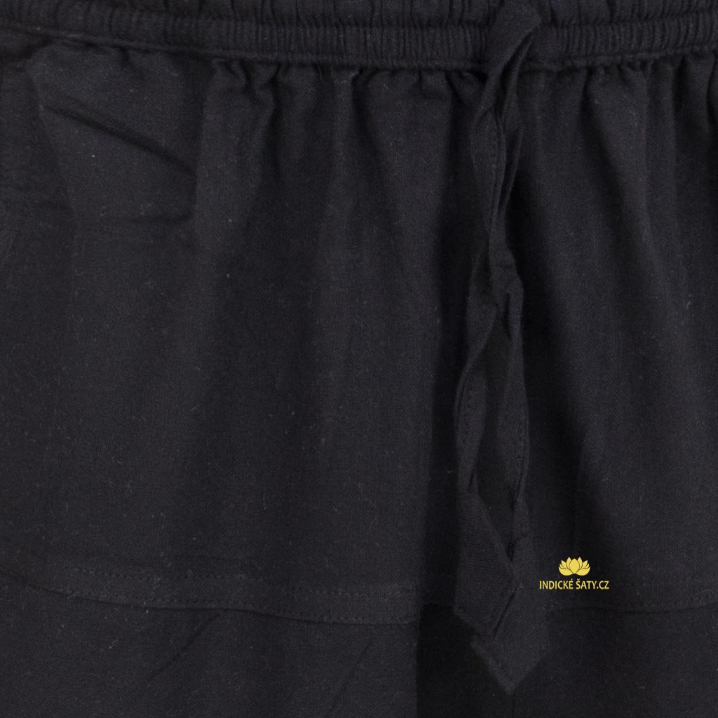 V pase je širší (4 cm) pohodlná guma, doplněná o stahování na bavlněné provázky, které jsou ukončené látkovým zvonečkem. Takto řešený pase se přizpůsobí více velikostem. Nohavice jsou ukončené na tenčí gumičku (lze podkasat). Sed je nízký, dostatečně široký. V pase na přední straně najdete dvě otevřené větší, dvě menší otevřené kapsičky jsou také na bocích u kolen.