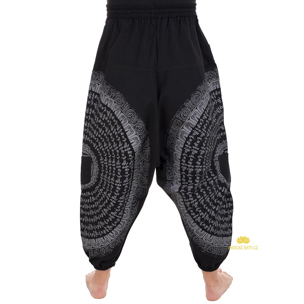 Unisex harémové kalhoty ušité z pevné a odolné bavlny zdobené mantrovým tiskem. Více v popisu níže.