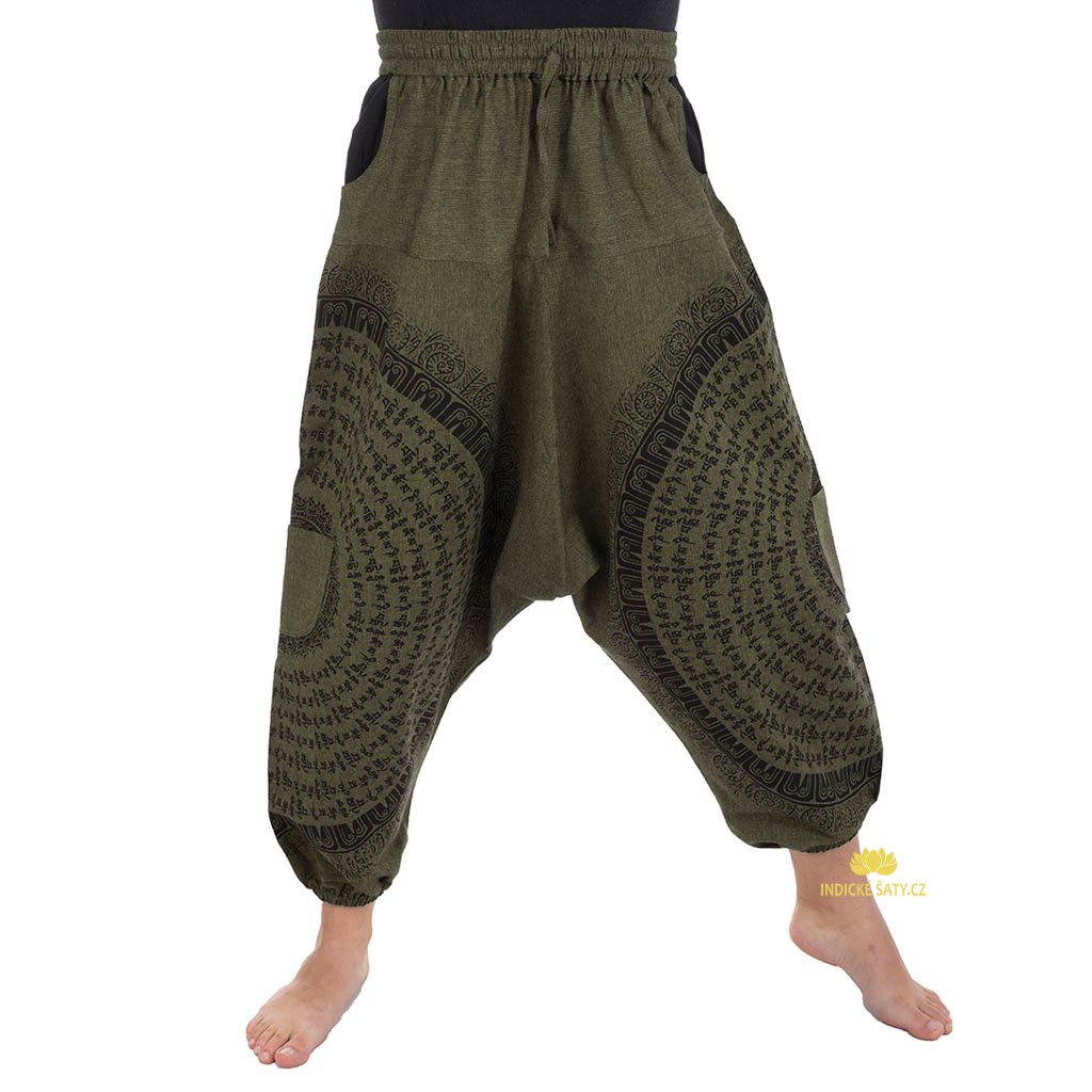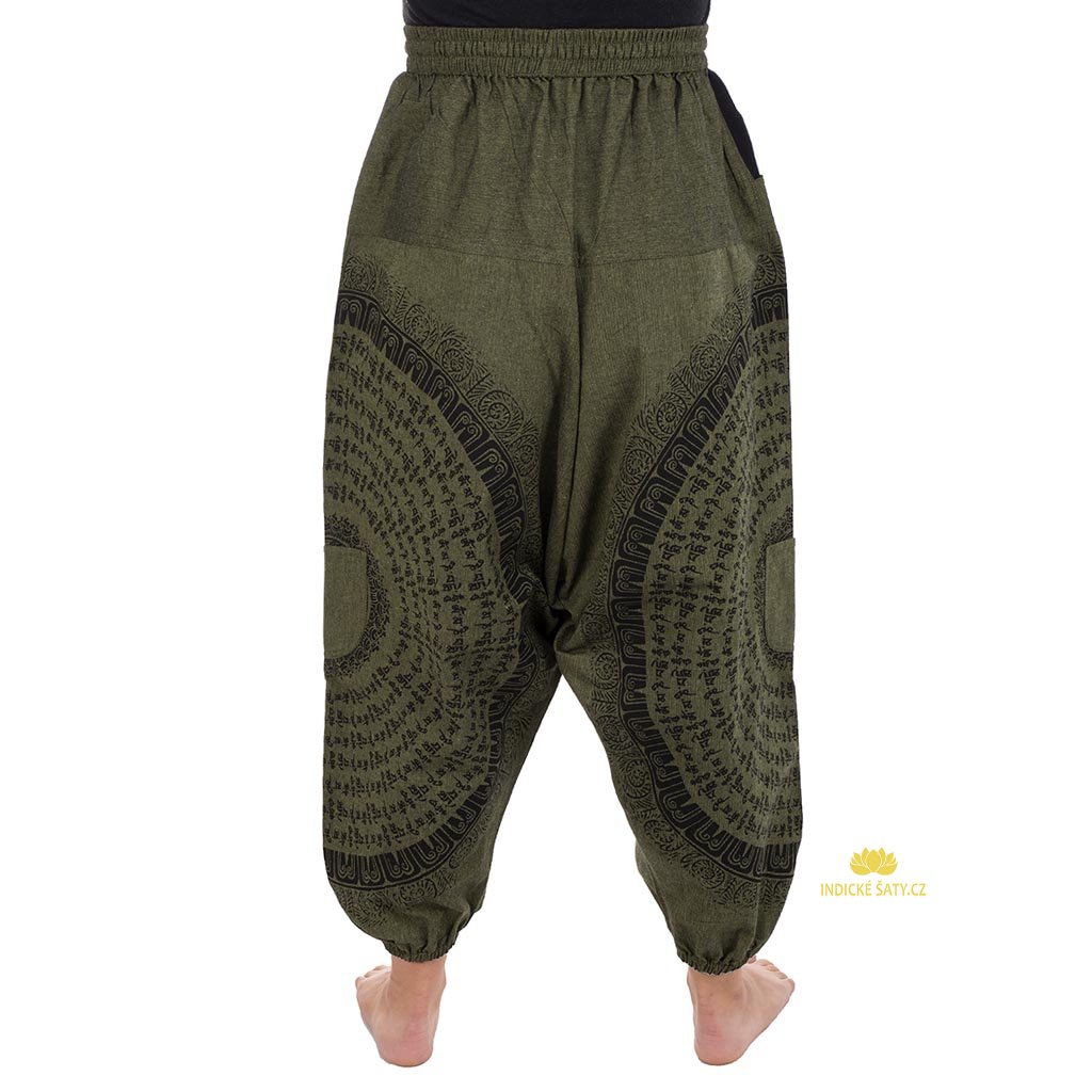 Unisex harémové kalhoty ušité z pevné a odolné bavlny zdobené mantrovým tiskem. Více v popisu níže.