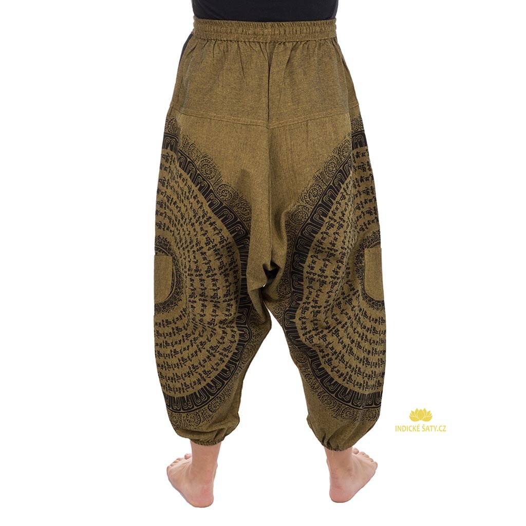 Unisex harémové kalhoty ušité z pevné a odolné bavlny zdobené mantrovým tiskem. Více v popisu níže.
