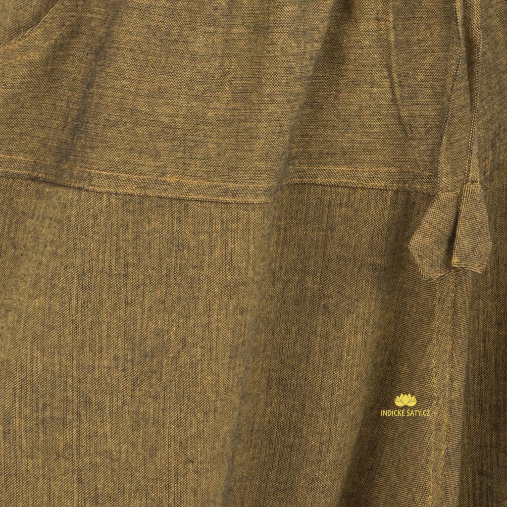 Harémové kalhoty jsou ušité z pevné kvalitní bavlny. Látka je silnější, vzdušná, připománající pevné plátno, neprůhledná, odolná. Kalhoty jsou jednobarevné.