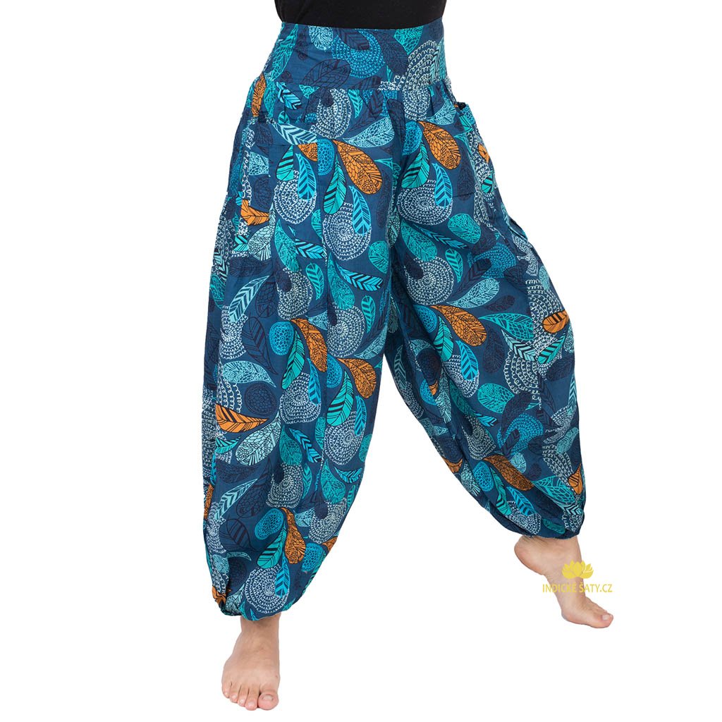Střih kalhot je klasický, nohavice širší (v oblasti kolen je šířka cca 40 cm). Nohavice jsou ukončené na tenčí gumičky (balun), dají se tak lehce podkasat. Pas je ze zadní strany řešený na širší žabičkování (cca 8 cm), díky tomu se v pase roztáhne přes více velikostí. Přední strana pasu je rovný pruh látky. Na bocích dvě kapsičky velikosti na dlaň.