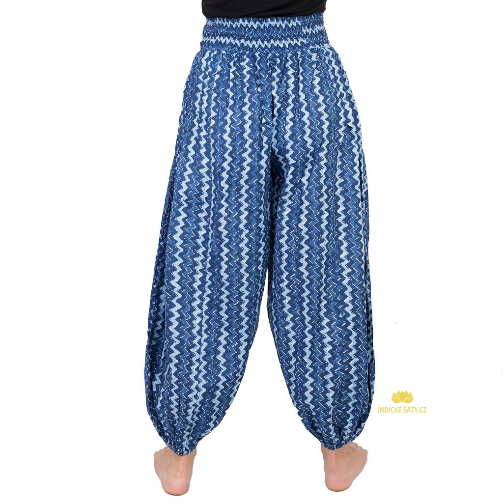 Střih kalhot je klasický, nohavice širší (v oblasti kolen je šířka cca 40 cm). Nohavice jsou ukončené na tenčí gumičky (balun), dají se tak lehce podkasat. Pas je ze zadní strany řešený na širší žabičkování (cca 8 cm), díky tomu se v pase roztáhne přes více velikostí. Přední strana pasu je rovný pruh látky. Na bocích dvě kapsičky velikosti na dlaň.
