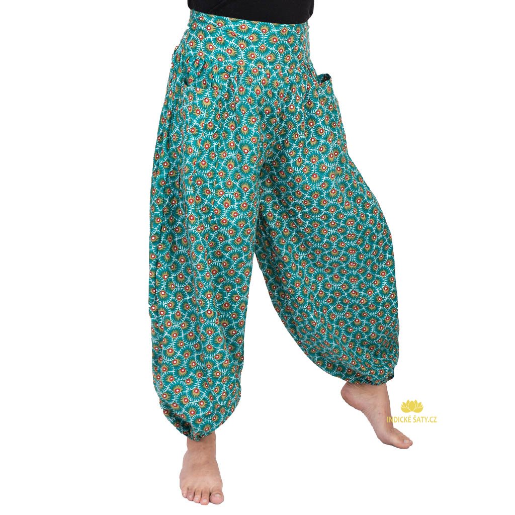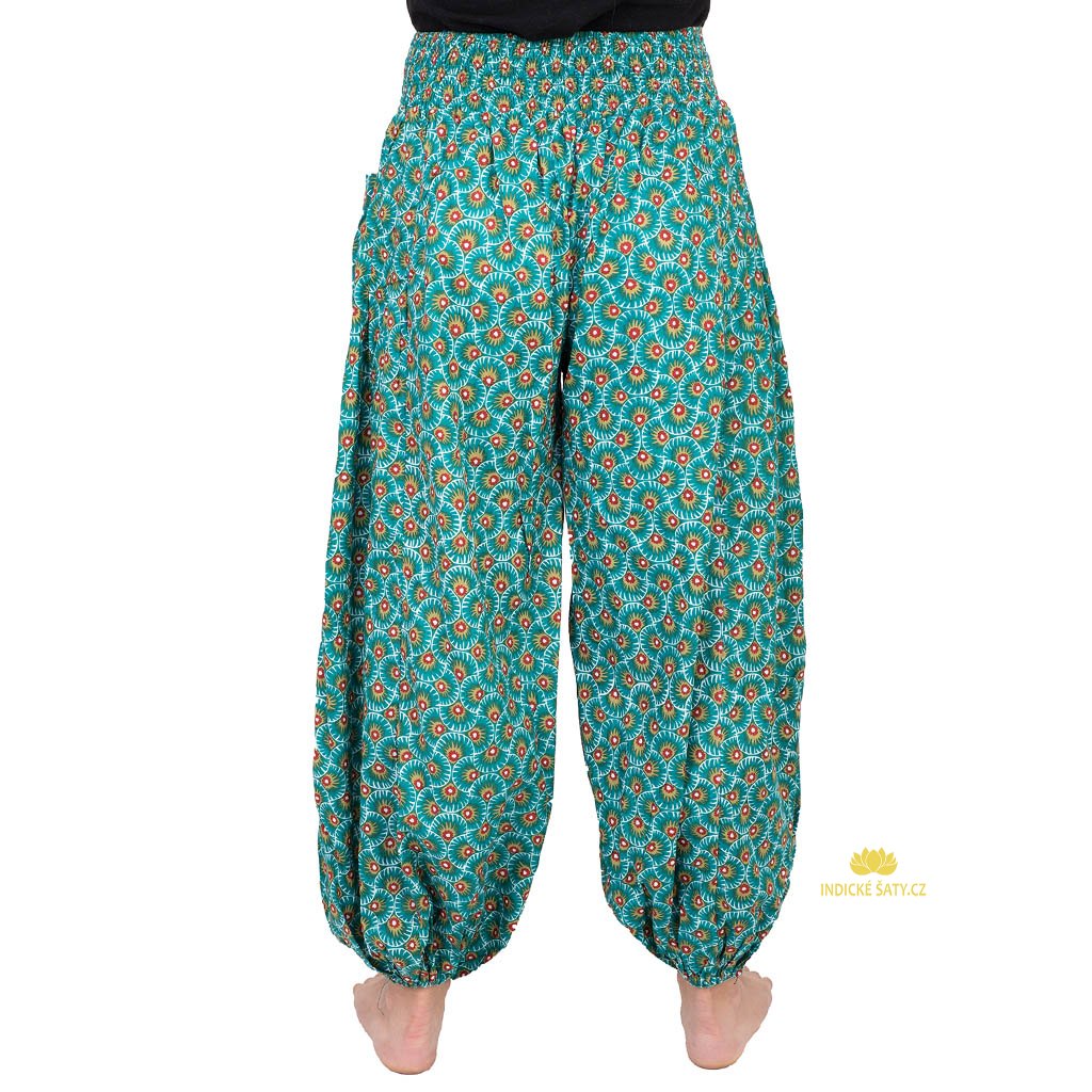 Kalhoty ušité z jemné bavlny s širokými nohavicemi a žabičkováním v pase. Více v popisu níže.