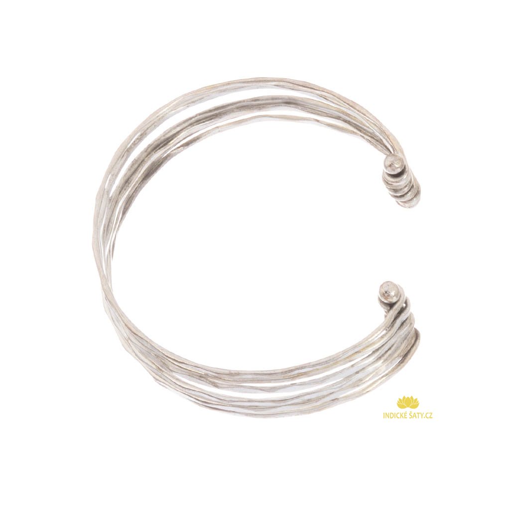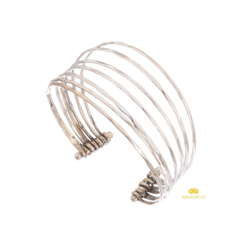 Tento Indický náramek je vyrobený ze 7 pásků vyrobených z alpaky, které jsou vyklepávané, na koncích spojené (tedy pásky jsou volné pohyblivé). Náramek je leštěný, tenčí (síla materiálu se pohybuje kolem 1-3 mm), lehce tvarovatelný. Náramek je na ruce lehký, přesto pevný a hezky zpracovaný.