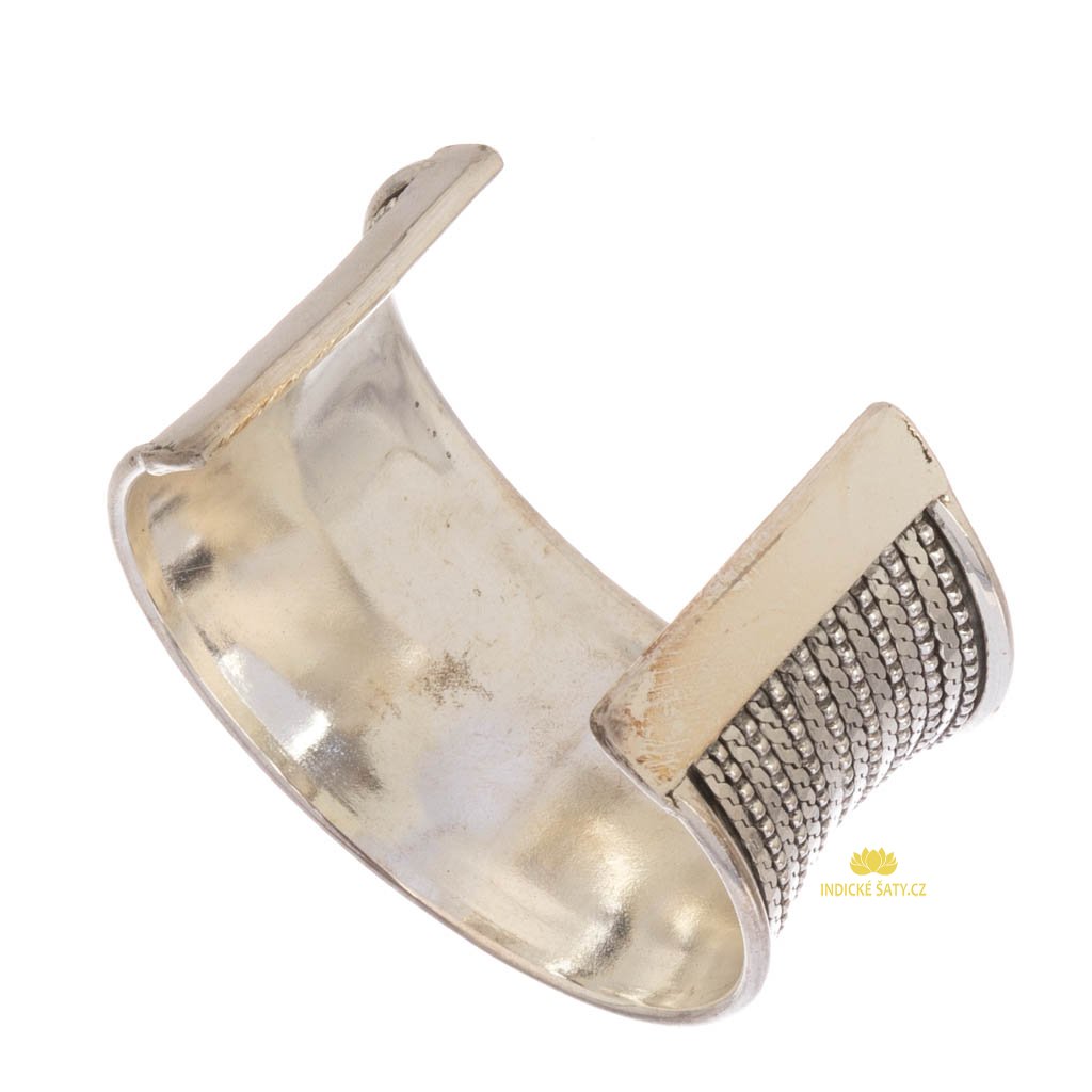 Tento Indický náramek je vyrobený z plátku z alpaky, který je z vnější strany dekorovaný, z vnitřní strany hladký. Je mírně prohnutý.