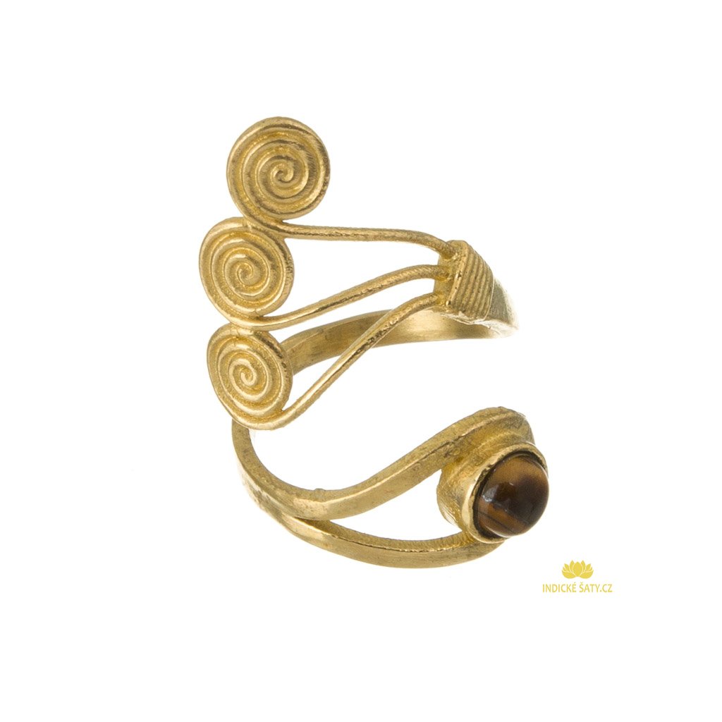 Tento indický prsten je vyrobený z mosazi (více o materiálech se můžete dočíst ve článku Měď, mosaz, alpaka | Z čeho se vyrábí kovové šperky v Nepálu ). Ze přední strany výrazný prvek, který je uchycen na stahovací kroužek vzadu. Vsazený minerál.