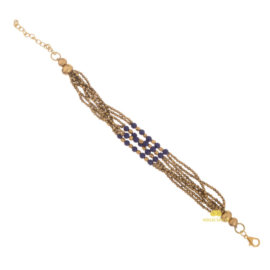 Tento indický náramek je vyrobený z drobných mosazných korálků navlečených na velmi pevné niti. Kovové korálky jsou doplněné ve středu o korálky / barvené kamínky. Náramek je vyroben z několika řad, které jsou volné, ohebné, přesto drží na ruce tvar.