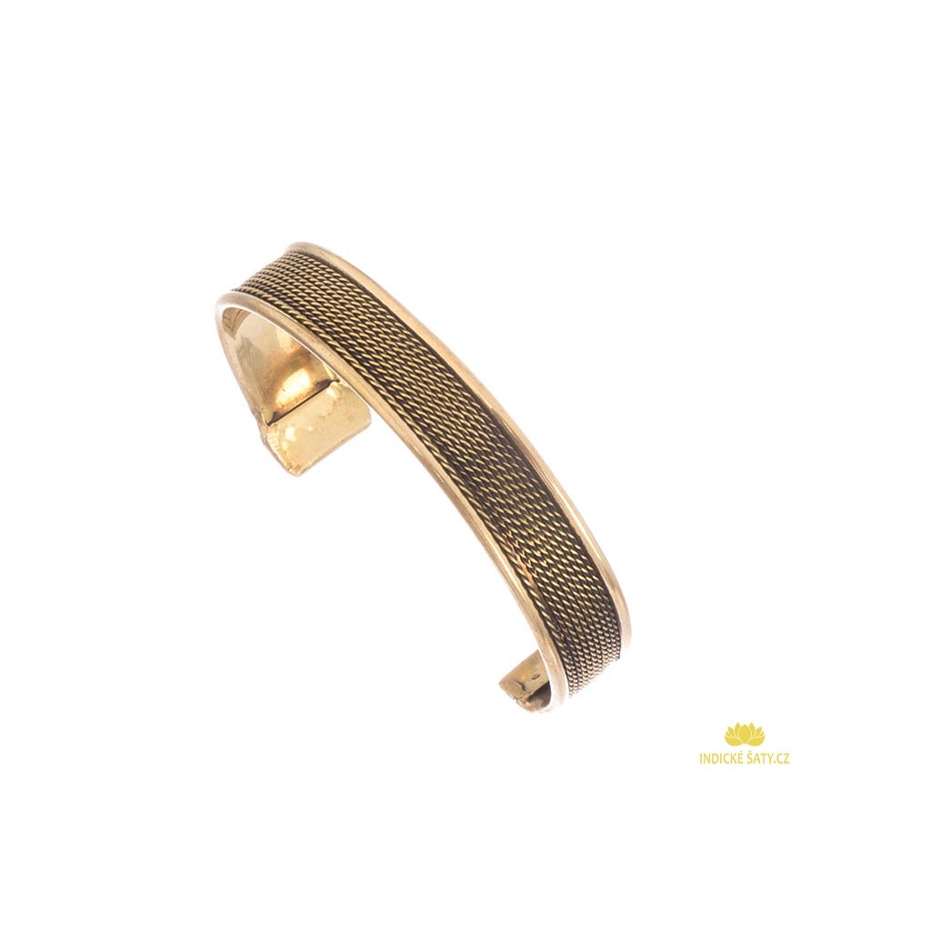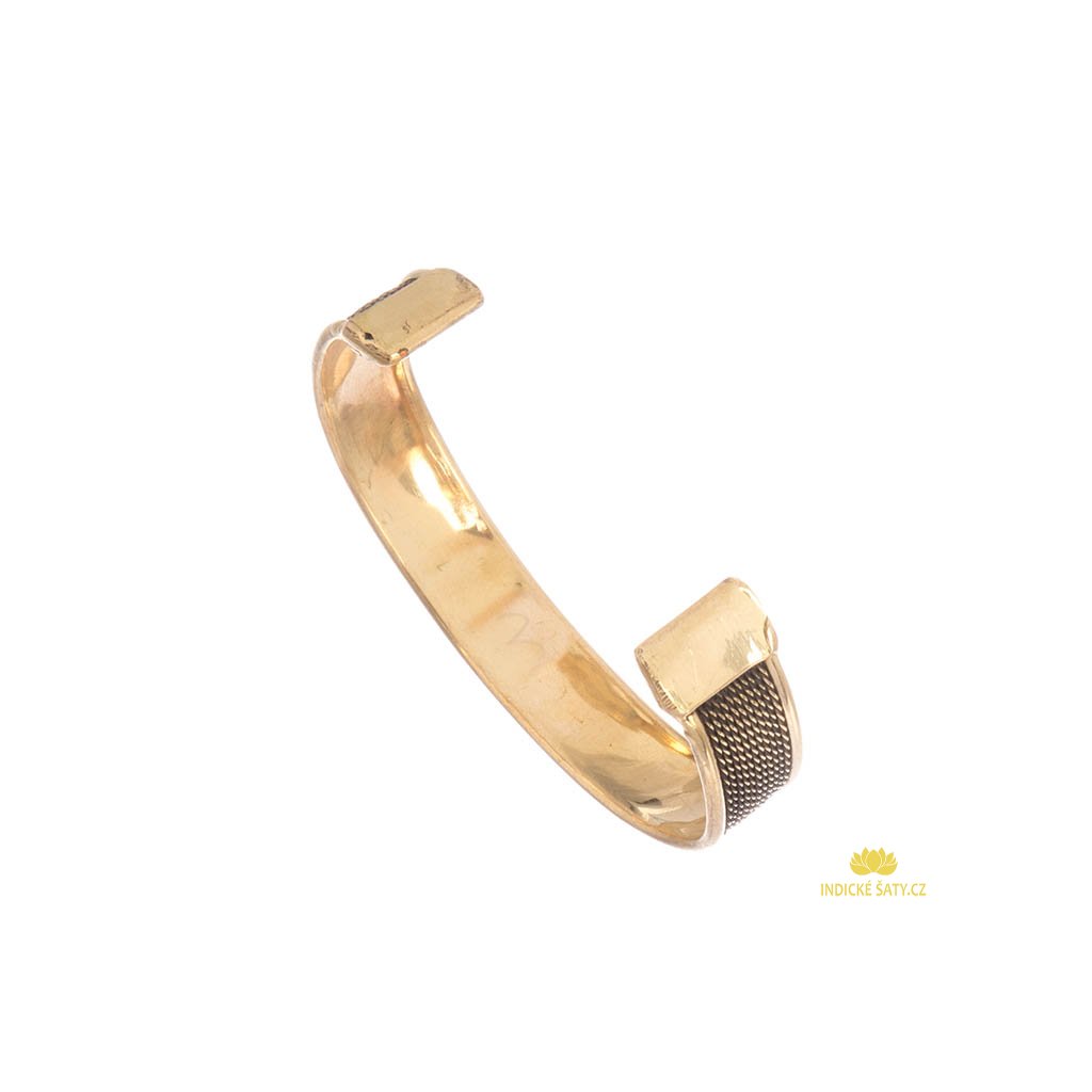 Tento Indický náramek je vyrobený z mosazného plátku. Plátek je leštěný, tenčí (síla materiálu se pohybuje kolem 1-3 mm), tvarovatelný. Náramek je na ruce lehký, přesto pevný a hezky zpracovaný.