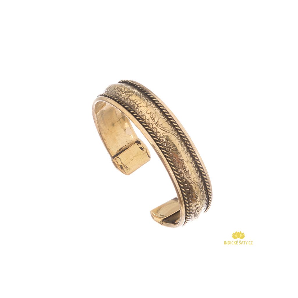 Tento Indický náramek je vyrobený z mosazného plátku. Plátek je leštěný, tenčí (síla materiálu se pohybuje kolem 1-3 mm), tvarovatelný. Náramek je na ruce lehký, přesto pevný a hezky zpracovaný.