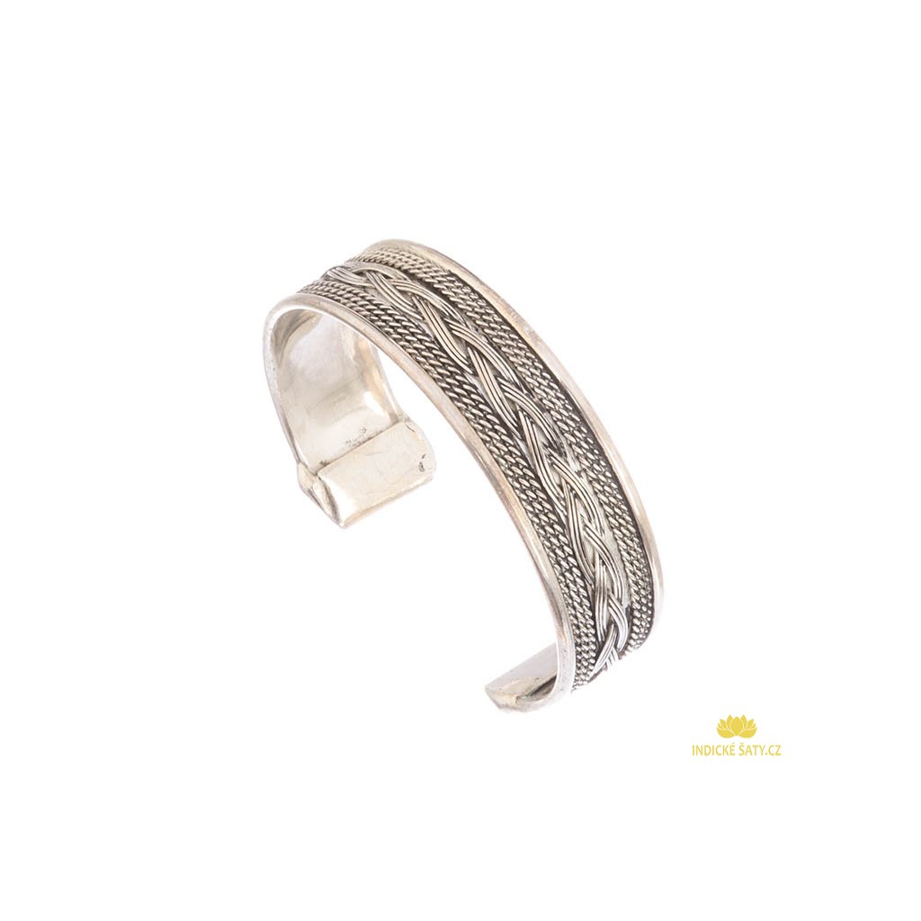 Tento Indický náramek je vyrobený z plátku alpaky. Plátek je leštěný, tenčí (síla materiálu se pohybuje kolem 1-3 mm), tvarovatelný. Náramek je na ruce lehký, přesto pevný a hezky zpracovaný.