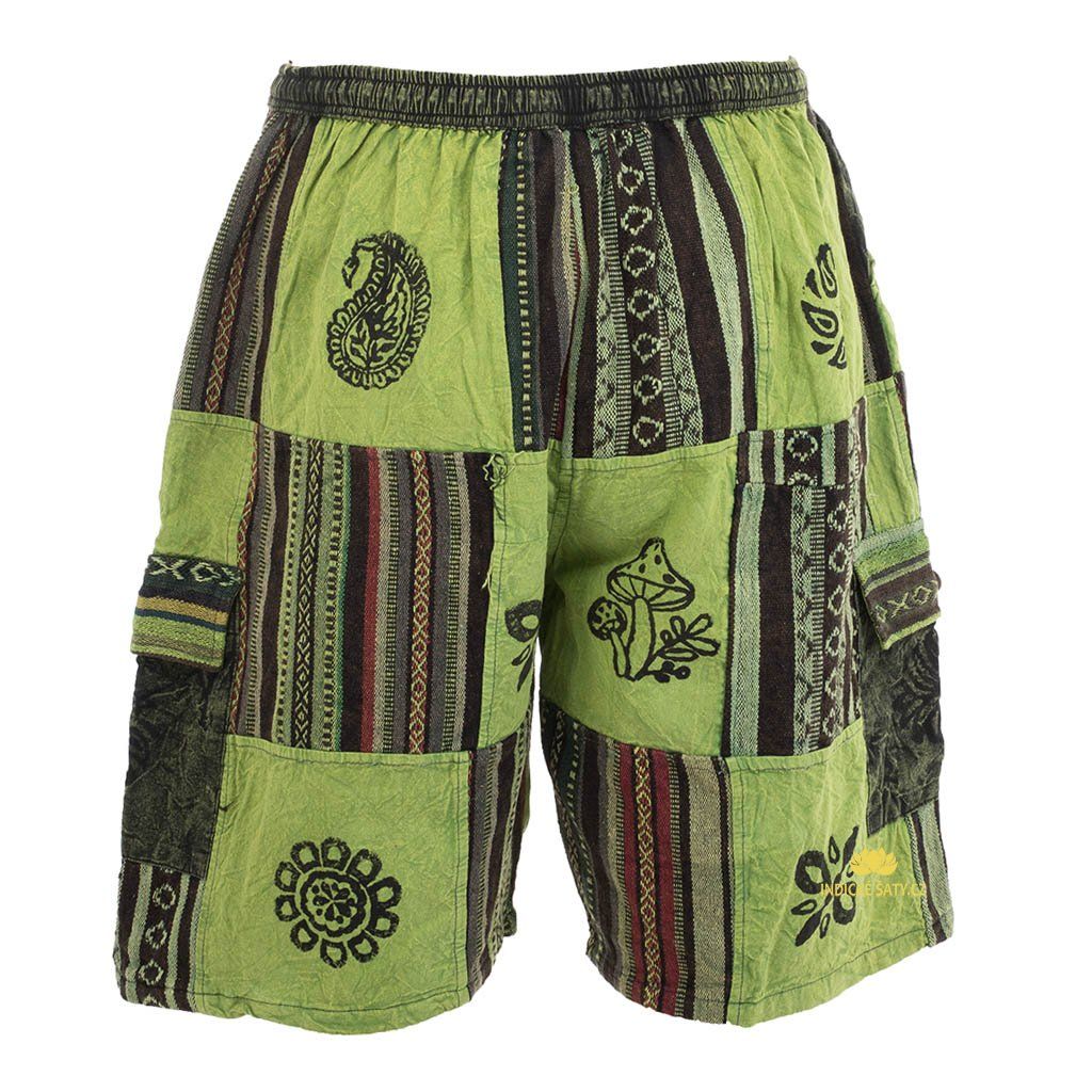 Kraťasy jsou šité ze dvou druhů látek - první je tkaná pevná bavlna, která se střídá s jednobarevnou stonewash bavlnou doplněnou o ruční tisk (cca 14 tisků).