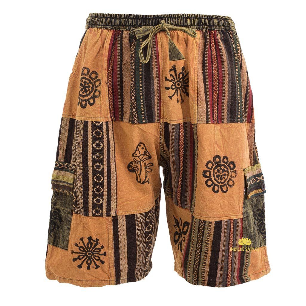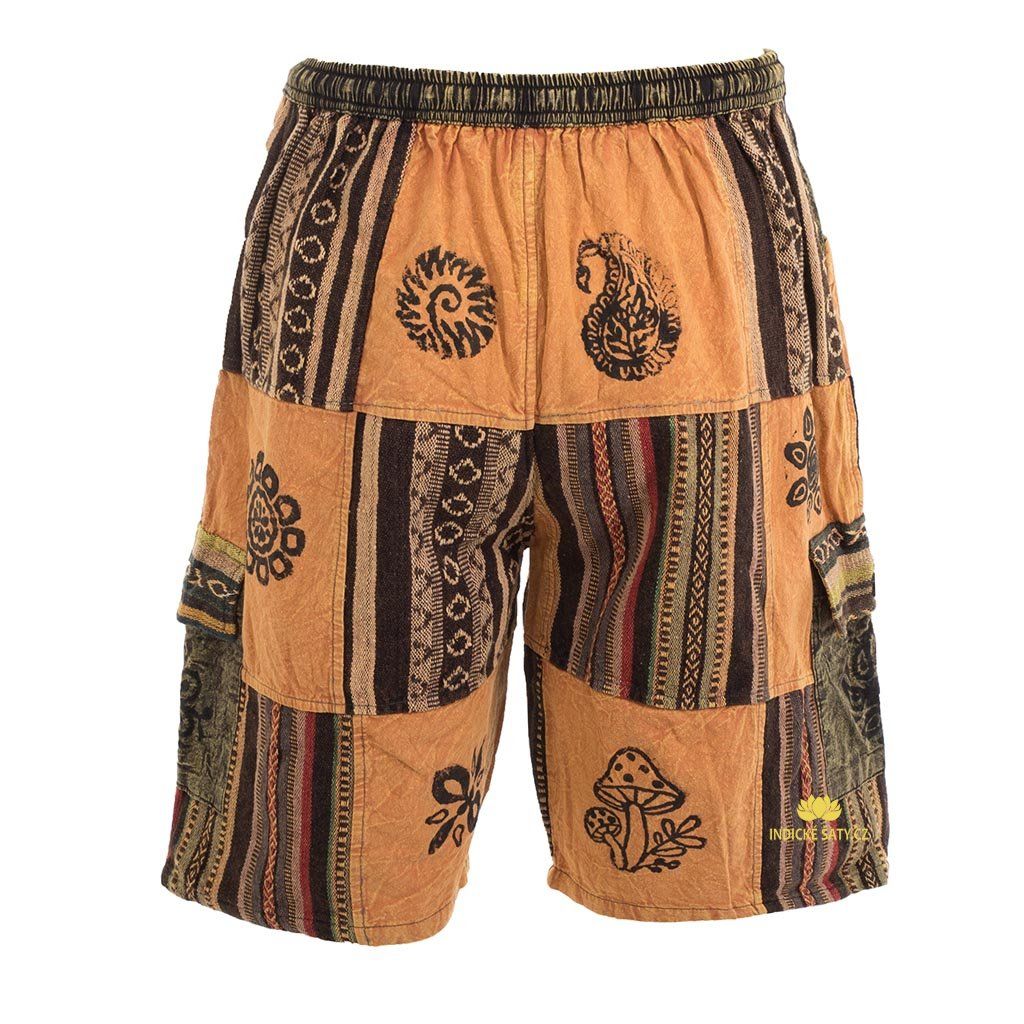 Kraťasy z pevné bavlny, ke kolenům, patchworkově šité. Více v popisu níže.