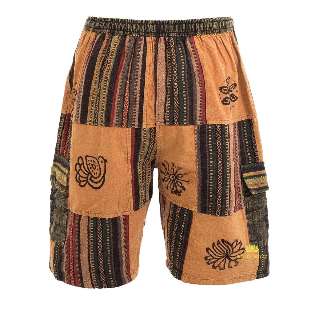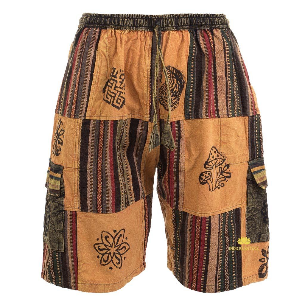 Kraťasy z pevné bavlny, ke kolenům, patchworkově šité. Více v popisu níže.