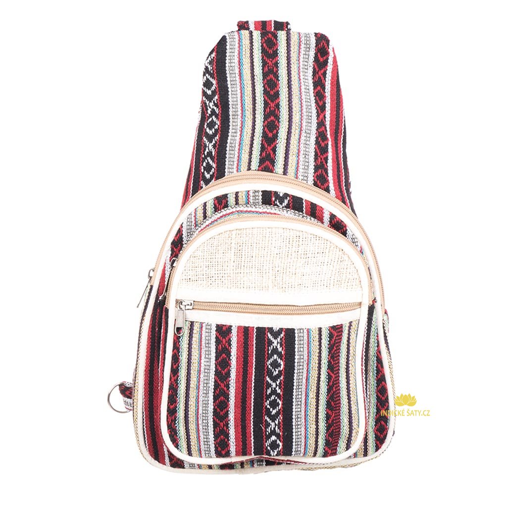 Taška má celkem tři kapsy, všechyn na zip - hlavní o velikosti 35 x 20 cm, prostřední a přední o velikosti 17 x 20 cm. Přední kapsa je v horní části šitá z konopné látky.