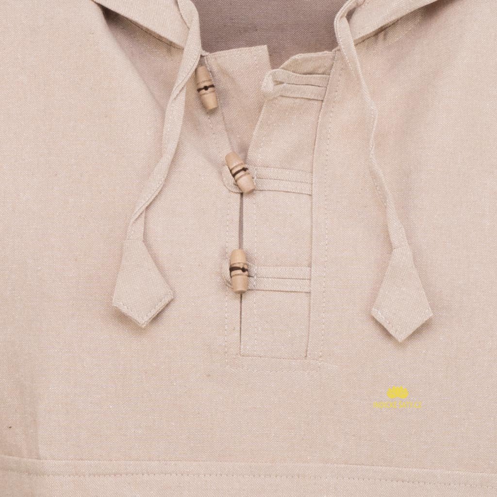 Pulover má dvě kapsy - větší klokánku na břiše, nad ní najdete kapsu na zip (17 x 17 cm), která je krytá delší klopou. Pulover má větší kapuci, která je stažitelná na bavlněné provázky ukončené látkovým zvonečkem. Výstřih je řešený do V se zapínáním na dřevěné knoflíky, které jsou podšité pruhem látky. Na spodní straně na obou bocích má pulover menší V rozparky (12 cm).