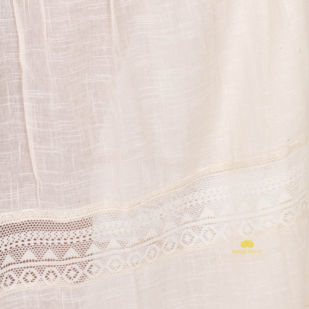Šaty zdobí po celém obvodu čtyři pruhy krajky, na spodním obvodu doplněné o drobné třepení. Výstřih je rovný, téměř ke krku a je ozdoben proužkem krajky.