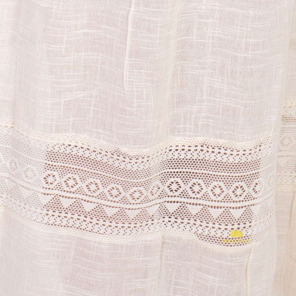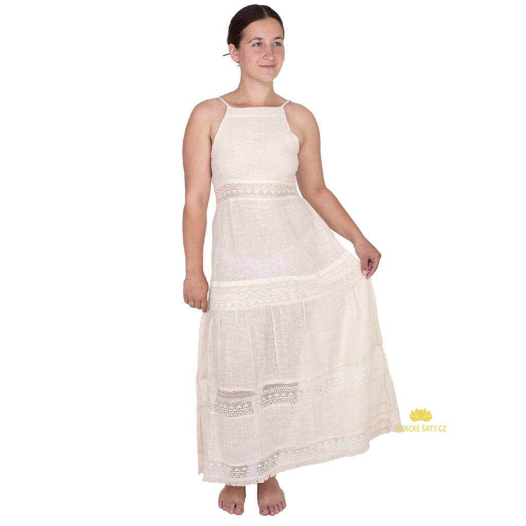 Lehké šaty z jemné bavlny se lnem s krajkou a třepením. Více v popisu níže.