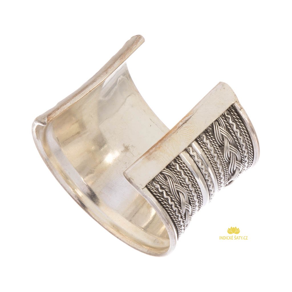 Tento Indický náramek je vyrobený z plátku z alpaky, který je z vnější strany dekorovaný, z vnitřní strany hladký. Je mírně prohnutý.