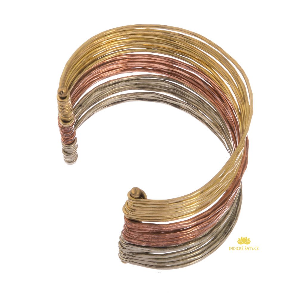 Tento Indický náramek je vyrobený z 24 pásků ze tří kovů - mosazi, mědi a alpaky, které jsou vyklepávané (tepané) a na koncích spojené (pásky jsou mírně pohyblivé, ale náramek drží tvar).