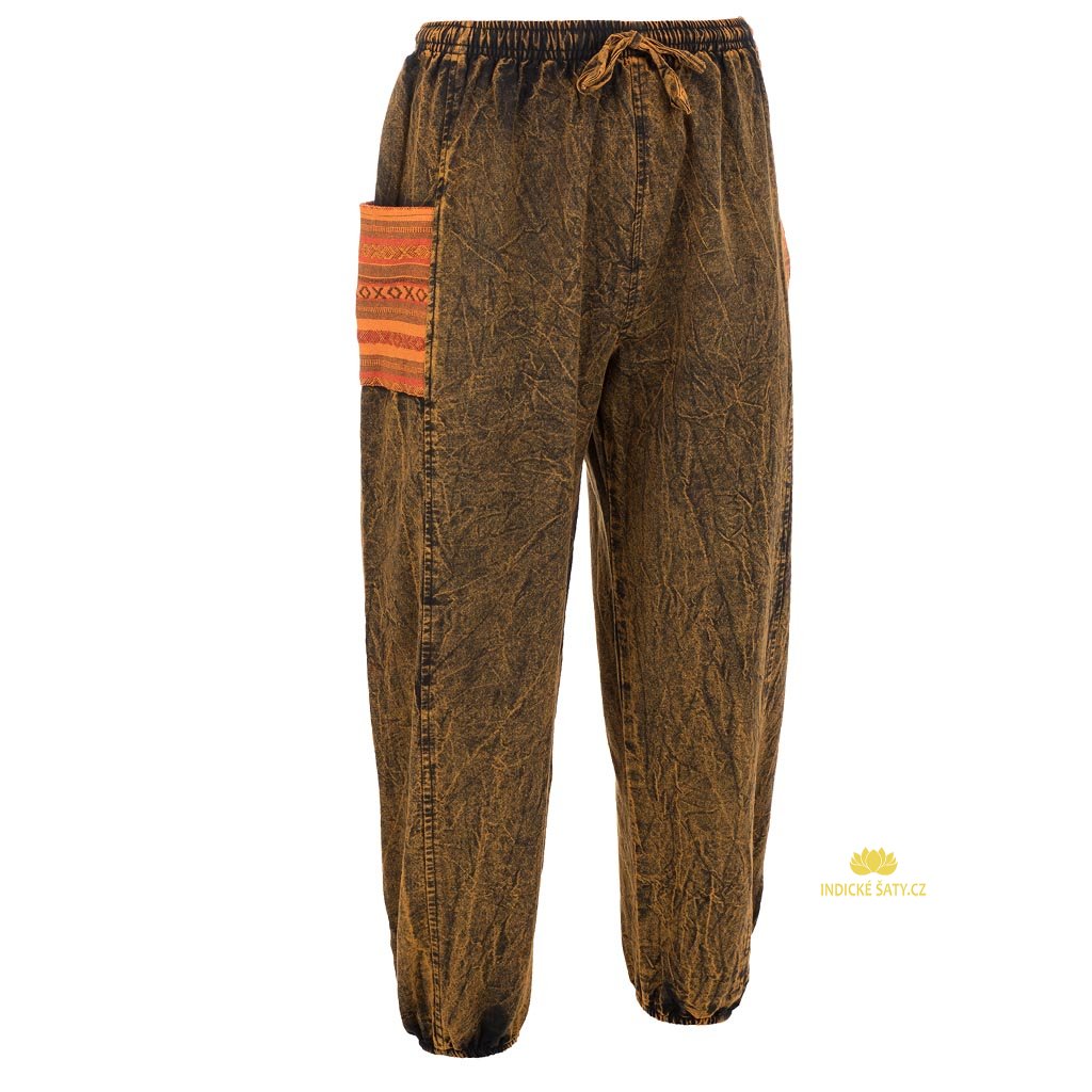 V pase mají kalhoty širší gumu (4 cm), a zdrhování na bavlněnou šňůrku ukončenou látkovými zvonečky. Díky takto řešenému pasu se dobře přizpůsobí více velikostem. Nohavice jsou ukončené na tenčí gumičku (cca 1 cm), díky tomu lze nohavice podkasat (styl balun), gumičky jsou dostatečně roztažitelné a nesvírají. Nohavice jsou širší (šířka v oblasti kolen cca 35 cm), pohodlné, vzdušné.