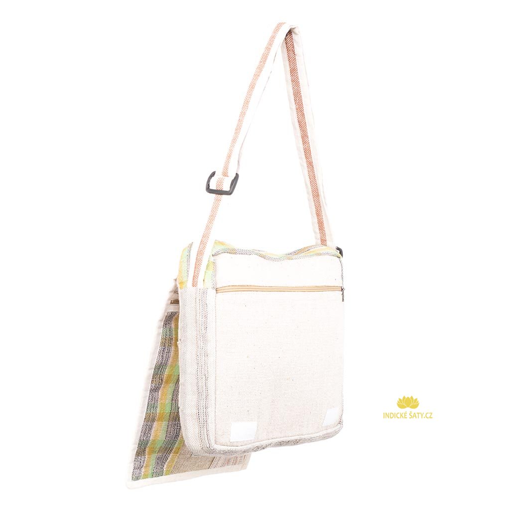 Tato větší taškaje ušitá z mixu bavlny a konopné látky. Nastavovací dlouhý popruh, 4 kapsy, hlavní 30 x 30 cm.