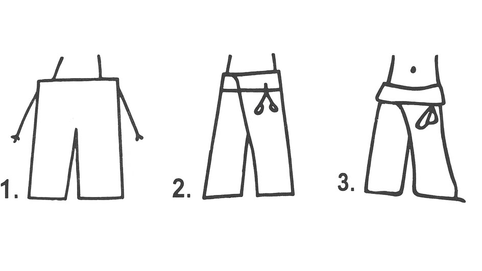 Kalhoty jsou pěkně ušité z pevnější prodyšené bavlny. Nohavice jsou volné, širší (šířka nohavice 30 cm). Každé kalhoty jsou zabalené v látkovém pytlíku s návodem.