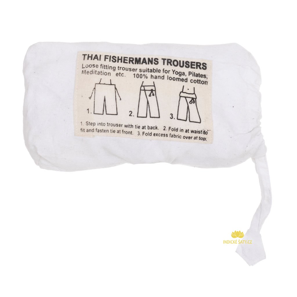 Thajské rybářské kalhoty jsou tradičním oblečením původem z Thajska. Vznikly jako praktický oděv, původně rybářů, ale díky svému praktickému střihu se dostaly do celé řady profesí a využijete je při mnoha příležitostech. Jedná se o široké volné kalhoty, které se zavazují v pase na dlouhé bavlněné provázky (ty jsou vzadu pevně přišité, délka jednoho je 100 cm). Pas se před zavázáním ještě založí a následně přehne horní část tak, aby byly provázky schované. Díky širokým nohavicím a obvou sedí mnoha velikostem (viz níže). Na boku je jedna otevřená kapsa.