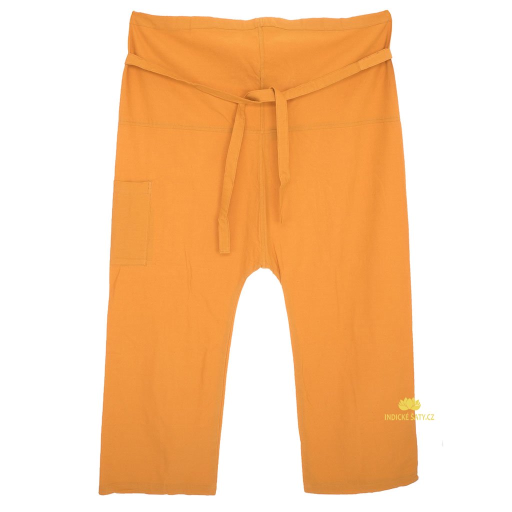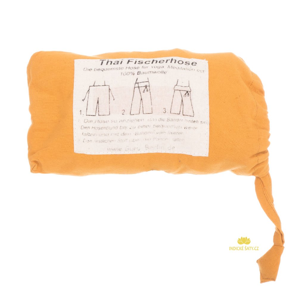 Thajské rybářské kalhoty jsou tradičním oblečením původem z Thajska. Vznikly jako praktický oděv, původně rybářů, ale díky svému praktickému střihu se dostaly do celé řady profesí a využijete je při mnoha příležitostech. Jedná se o široké volné kalhoty, které se zavazují v pase na dlouhé bavlněné provázky (ty jsou vzadu pevně přišité, délka jednoho je 100 cm). Pas se před zavázáním ještě založí a následně přehne horní část tak, aby byly provázky schované. Díky širokým nohavicím a obvou sedí mnoha velikostem (viz níže). Na boku je jedna otevřená kapsa.