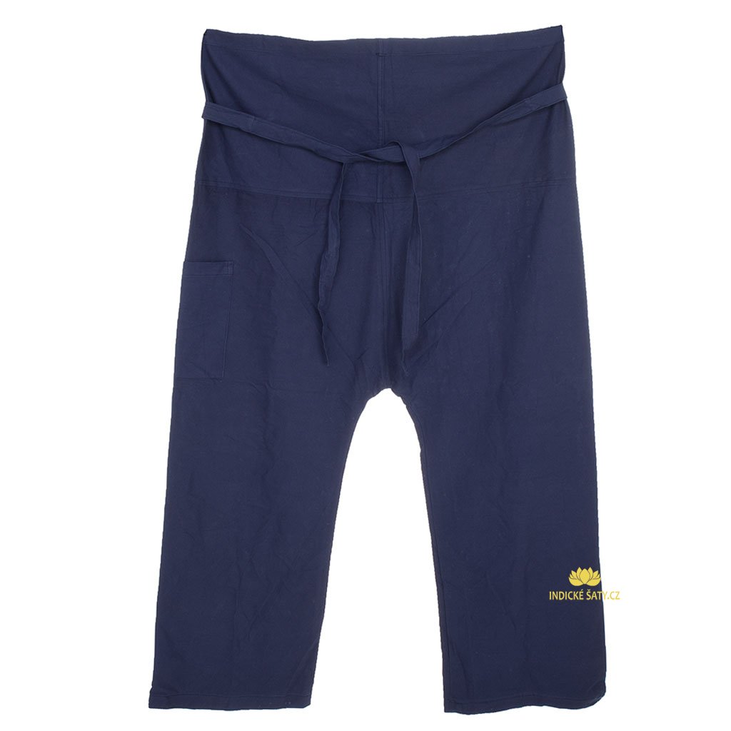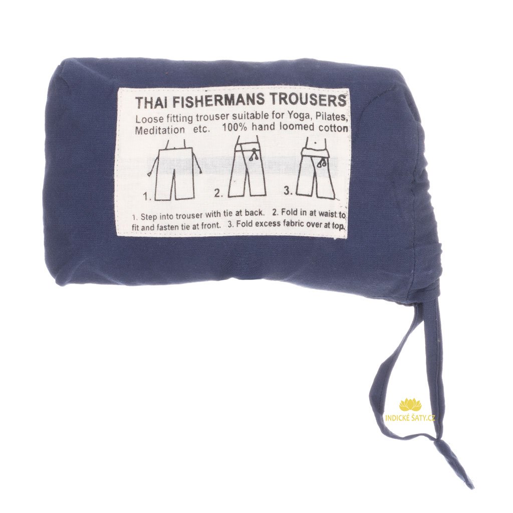 Thajské rybářské kalhoty jsou tradičním oblečením původem z Thajska. Vznikly jako praktický oděv, původně rybářů, ale díky svému praktickému střihu se dostaly do celé řady profesí a využijete je při mnoha příležitostech. Jedná se o široké volné kalhoty, které se zavazují v pase na dlouhé bavlněné provázky (ty jsou vzadu pevně přišité, délka jednoho je 100 cm). Pas se před zavázáním ještě založí a následně přehne horní část tak, aby byly provázky schované. Díky širokým nohavicím a obvou sedí mnoha velikostem (viz níže). Na boku je jedna otevřená kapsa.