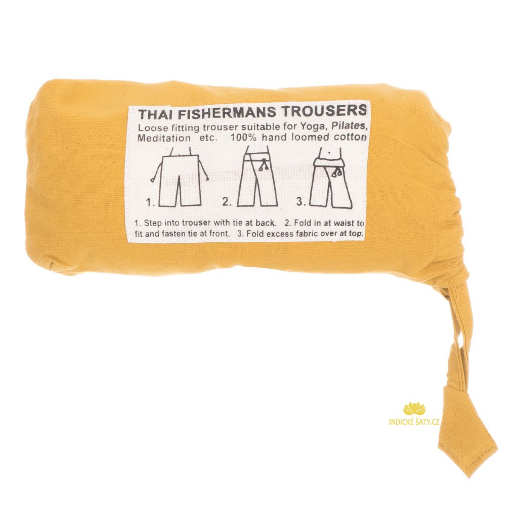 Thajské rybářské kalhoty jsou tradičním oblečením původem z Thajska. Vznikly jako praktický oděv, původně rybářů, ale díky svému praktickému střihu se dostaly do celé řady profesí a využijete je při mnoha příležitostech. Jedná se o široké volné kalhoty, které se zavazují v pase na dlouhé bavlněné provázky (ty jsou vzadu pevně přišité, délka jednoho je 100 cm). Pas se před zavázáním ještě založí a následně přehne horní část tak, aby byly provázky schované. Díky širokým nohavicím a obvou sedí mnoha velikostem (viz níže). Na boku je jedna otevřená kapsa.