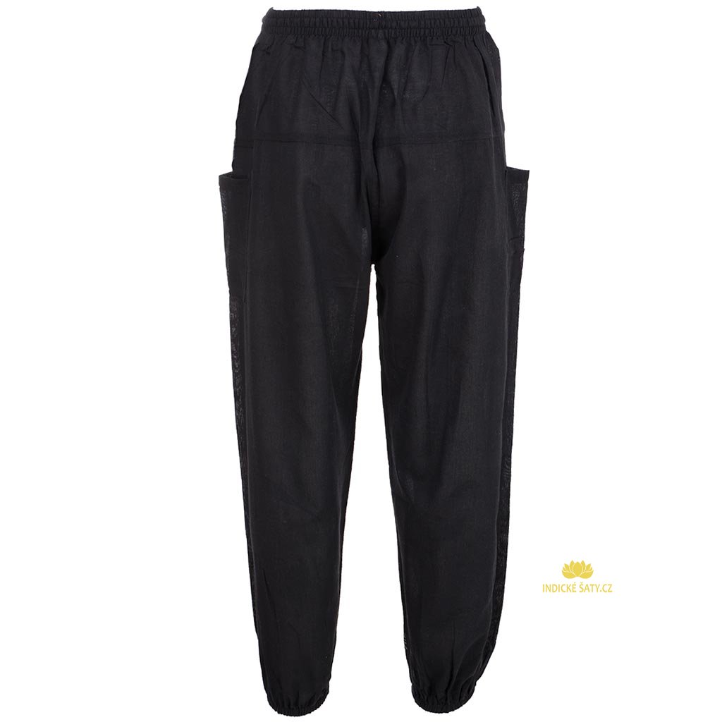 Kalhoty mají pas řešený na širší a pohodlnou gumu (cca 5 cm), která se roztáhne přes více velikostí, doplněnou o stahování na bavlněné šňůrky ukončené látkovým zvonečkem. Nohavice jsou pohodlné a mírně širší (cca 30 cm), sed lehce níž (končí zhruba v půli stehen) a nohavice jsou ukončené širší pohodlnou gumou (balun), díky čemuž lze nohavice vykasat či stáhnout dle potřeby. Kalhoty mají v pase dvě kapsy velikosti na dlaň.