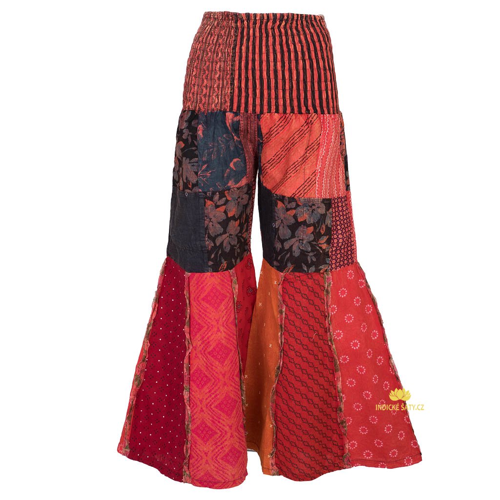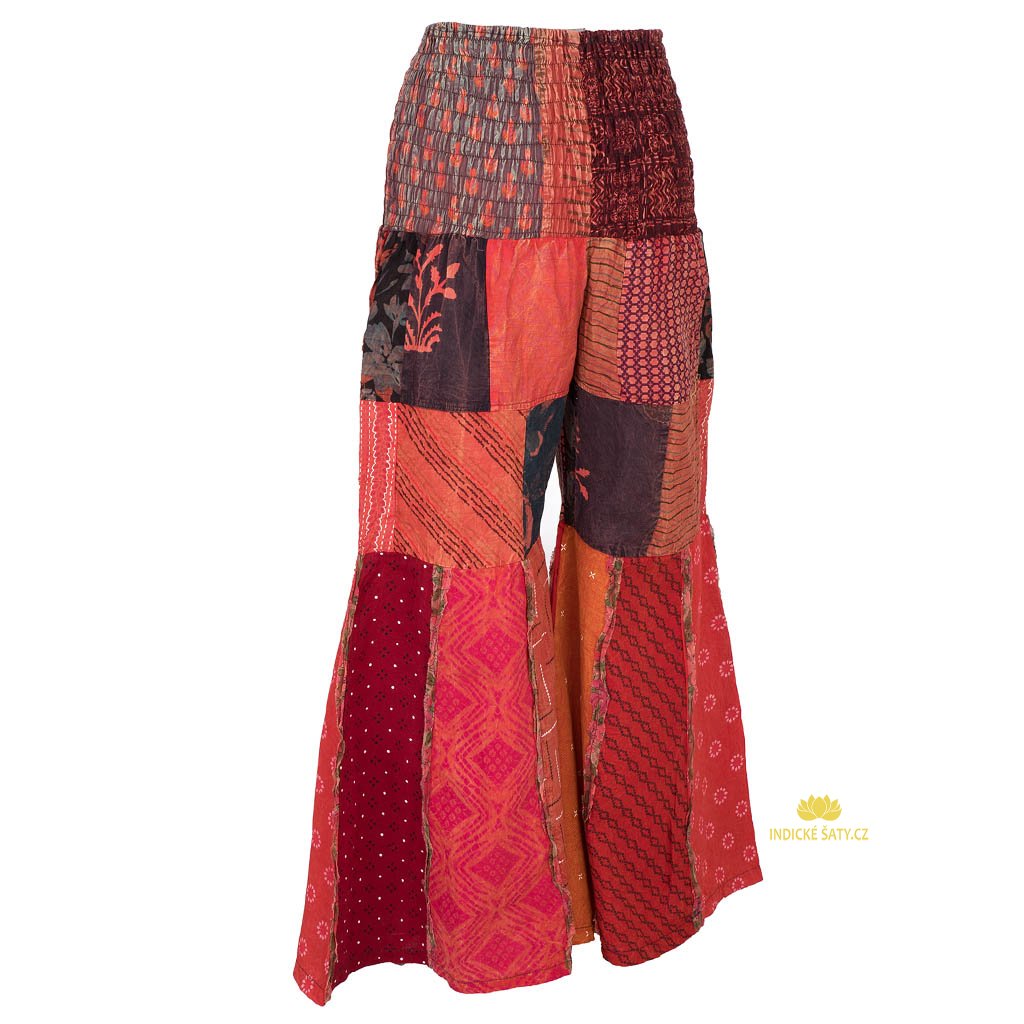 Bavlněné kalhoty do zvonu patchworkově šité, s širokým žabičkováním. Více v popisu níže.